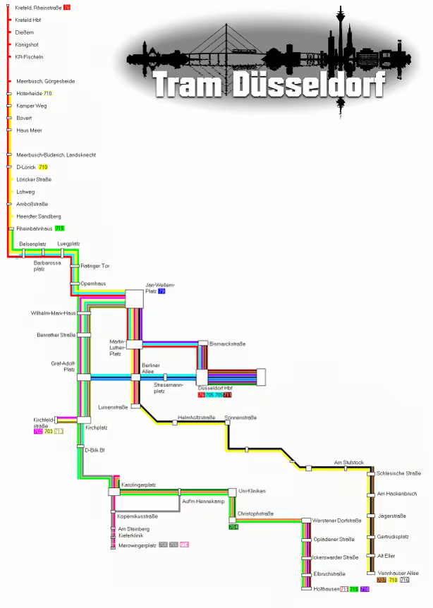 For fans of debauched track systems, the route offers the four-track stop Hauptbahnhof with a three-track turning loop and an extra turning track for line 76, Jan-Wellem-Platz with its countless train and bus platforms, the three-track stops Opera House, Belsenplatz and Meerbusch-Haus Meer , the Meerbusch-Hoterheide reversing loop with an equally abstruse track layout and the four-rail track in Krefeld with the old turning system on Rheinstrasse in Krefeld.