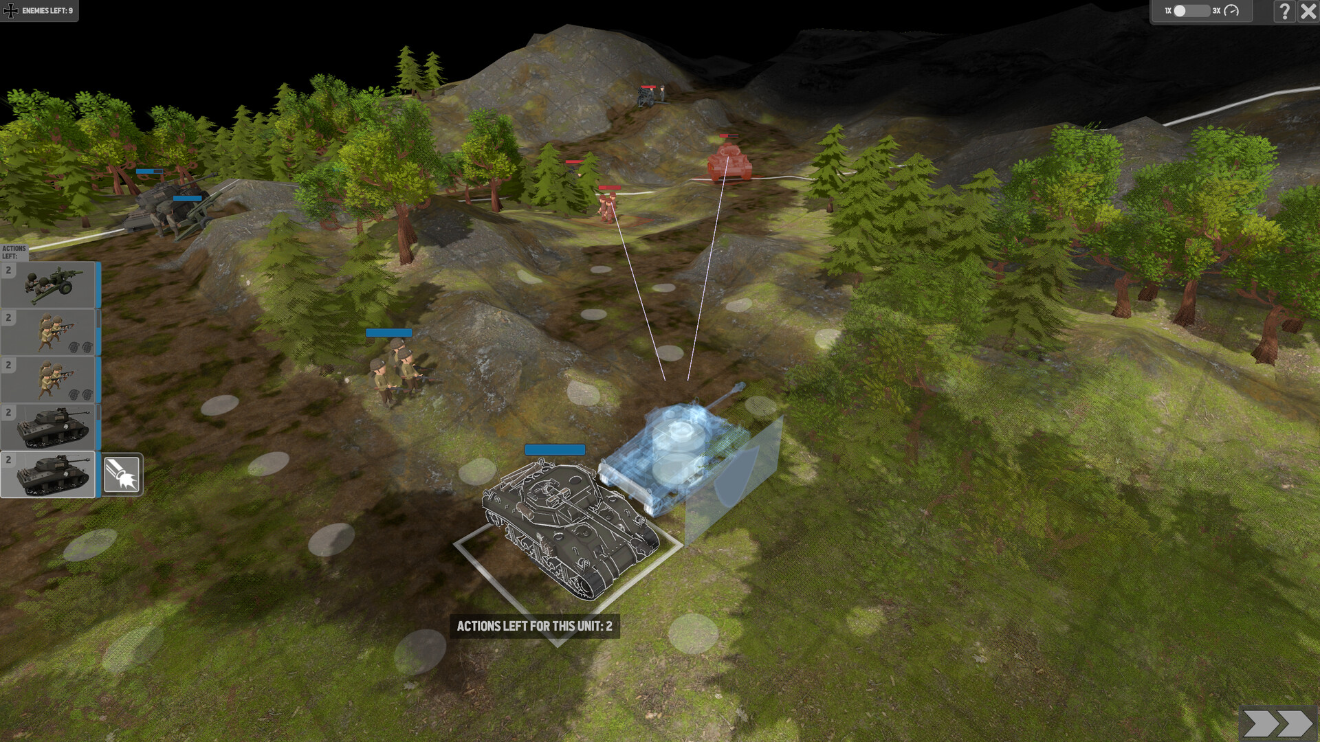 Tactical turn-based combat in WW2. Lead U.S. infantry, tanks, and artillery through procedurally generated battlefields. Use cover and clever tactics to outmaneuver German forces in this replayable combat demo.