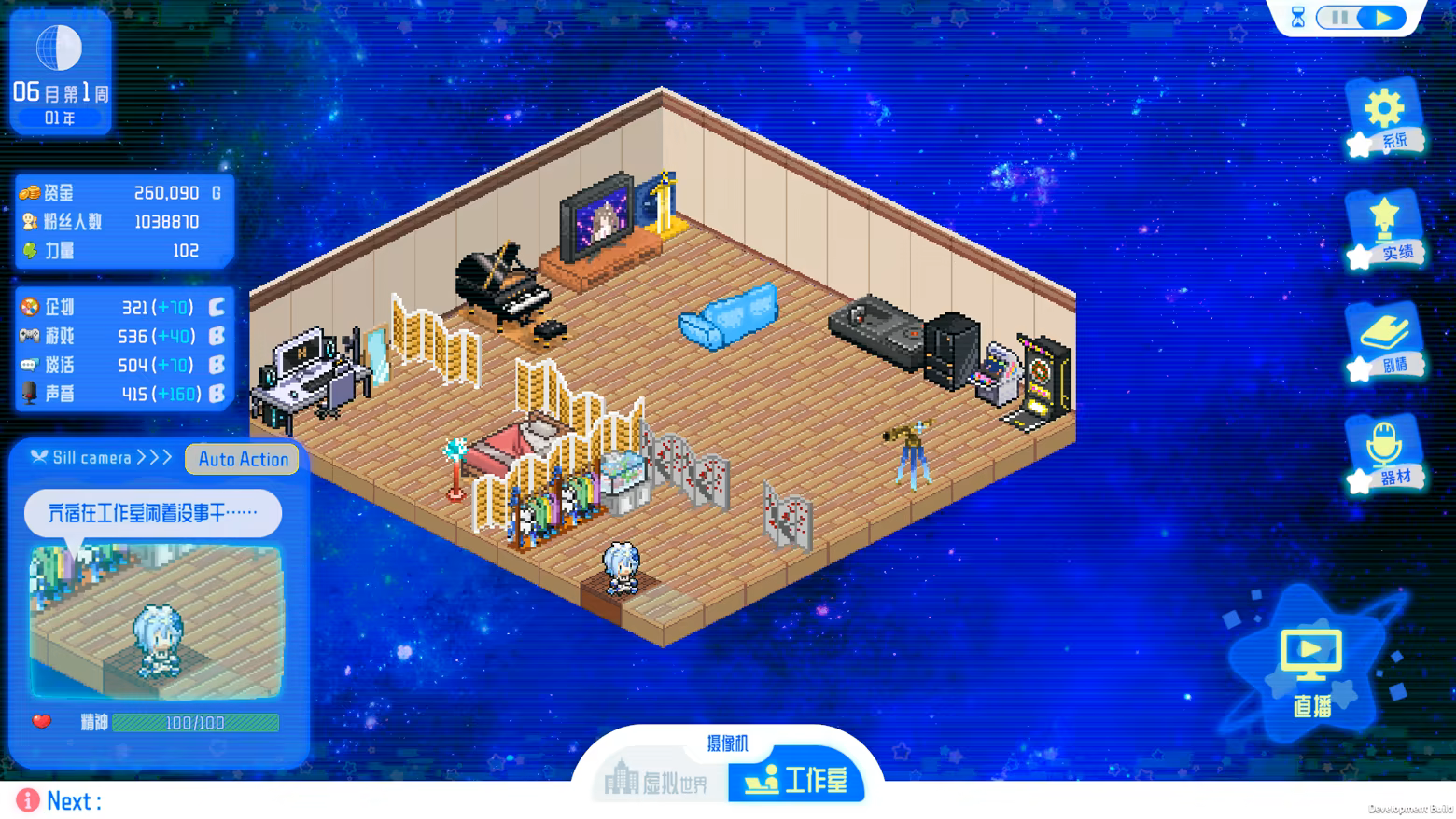 在这个游戏中,可以通过在工作室布置各种家具和器材来提升亢宿的状态。随着状态的提升,直播效果也会更好,从而获得更多奖励。