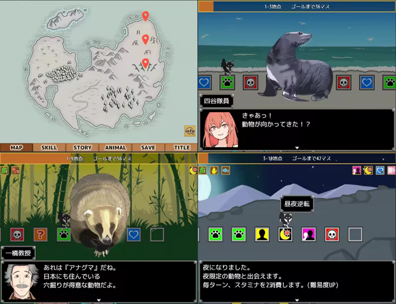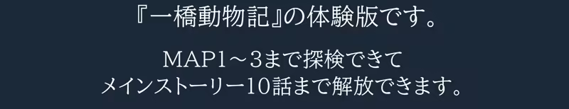 This is the trial version of "Hitotsubashi Animal Chronicles." This is an adventure game in which you lead an expedition team and aim to "traverse a mysterious island" filled with wild animals and "discover animals." You can explore up to MAP3 and watch up to 10 episodes of the story.