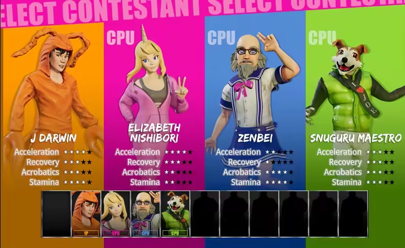 Trillions of possible combinations: heads, bodies, hair, moustaches, eyebrows, hats, clothes, backpacks, tails, and even voices. Save up to 20 contestants, synced via Steam Cloud. From cute kawaii mascots to utter nightmare-fuel, let your imagination run wild!