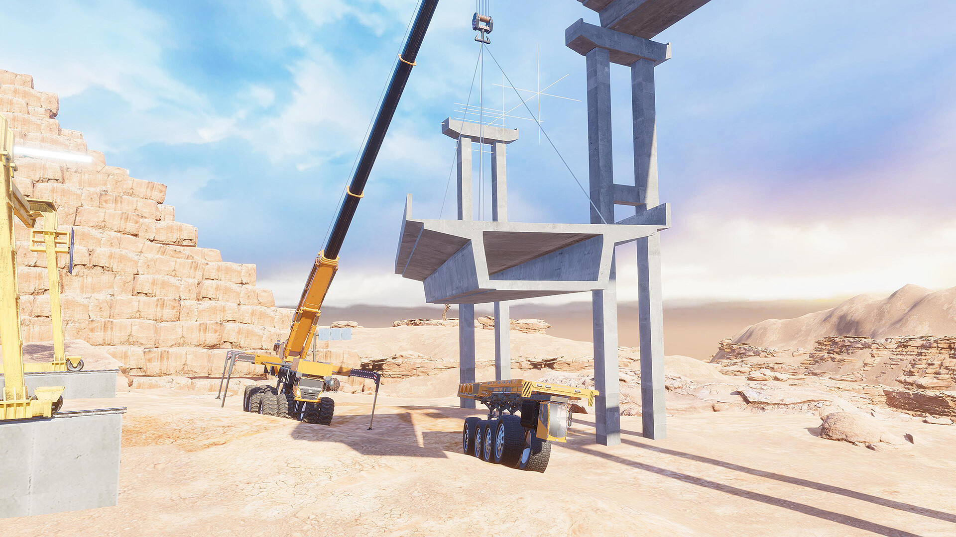 部分任务的目的地无法直接抵达,需要进行地图建造。地图上分布着商店,你可以在其中购买混凝土预制件、岩石等建材。组装平板车将建材运输至指定地点,再驾驶吊车进行建造(最大的用途便是架桥),这将使你未来的任务之旅更加轻松。你的所有建造物都会永久保存,尽情发挥你的想象力吧。