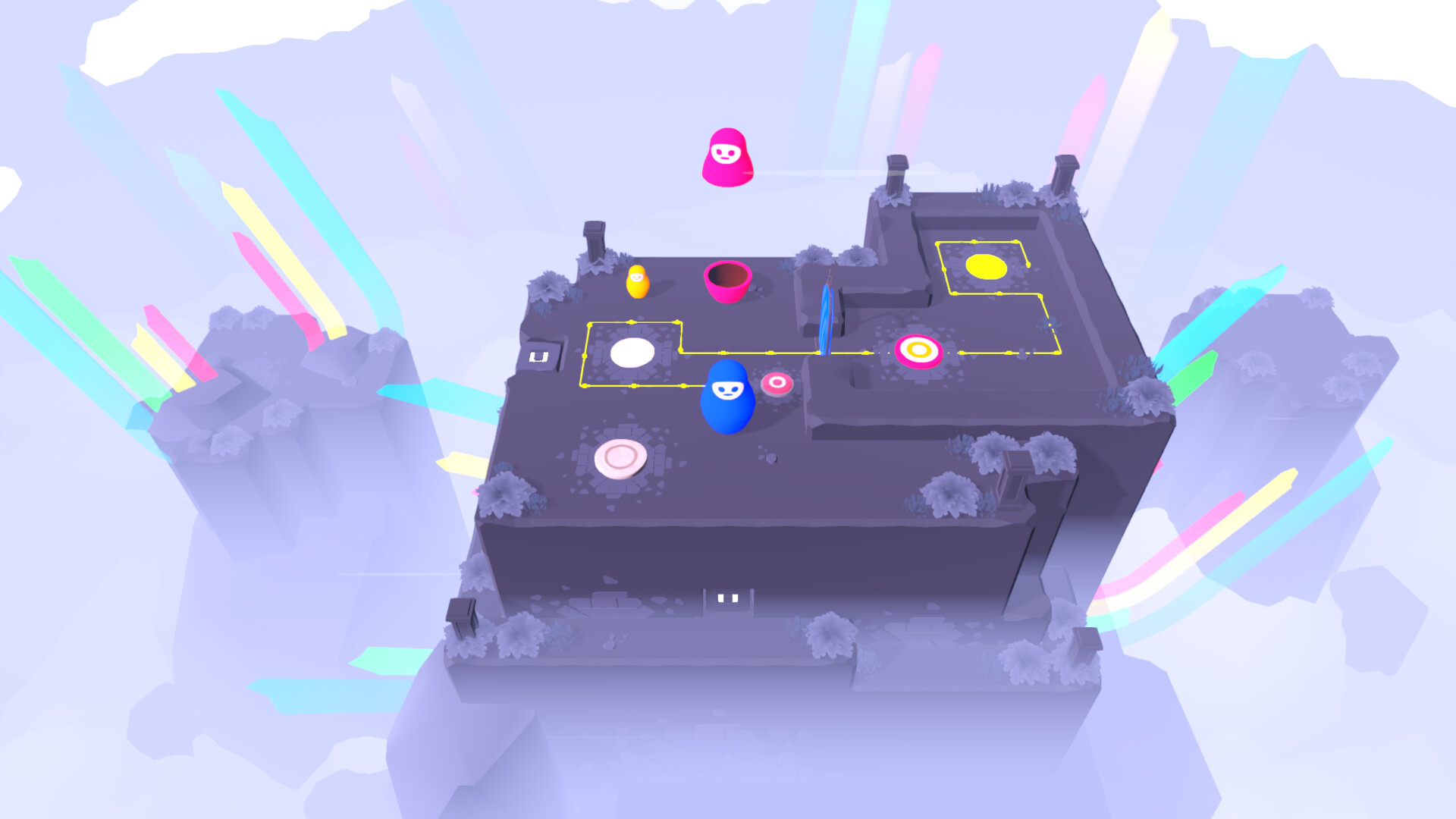 Nesting dolls can also interact with objects based on their size and color. For example, a pink door will let a pink nesting doll pass through, but not a yellow one.