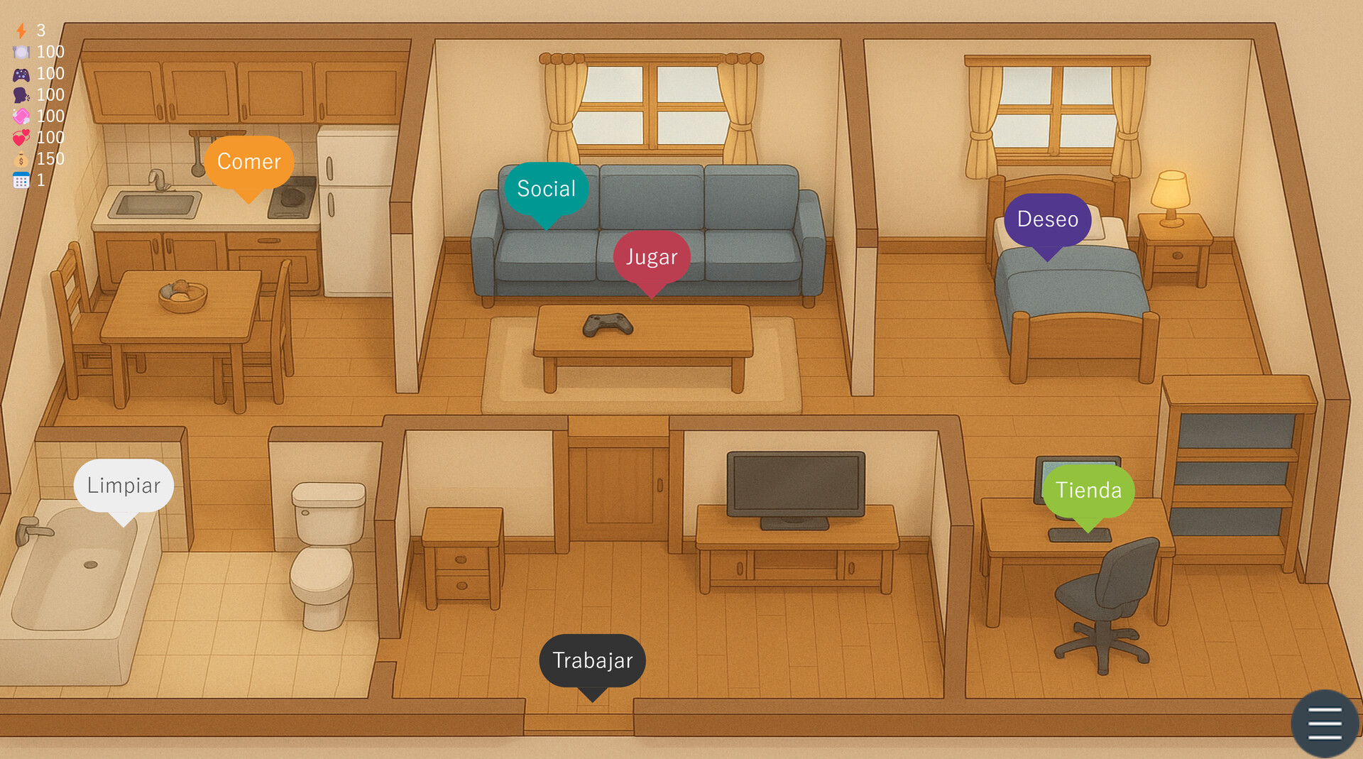 🧼 Choose where to work, come back home, interact with Mika, clean, cook, or play.