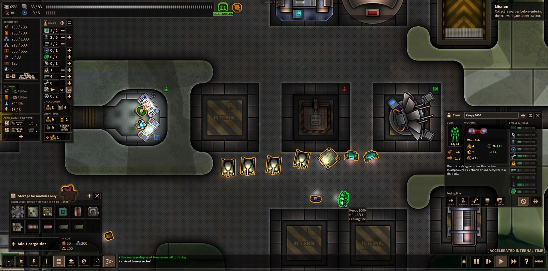 While the vessel is loaded with rockets, missiles, drones & nukes, there is naturally a downside. Most of the non-combat modules are missing or replaced with something (it's even missing a functional warpdrive). The player has to craft obtain these via crafting or otherwise for a fair chance of survival in the depths of space.