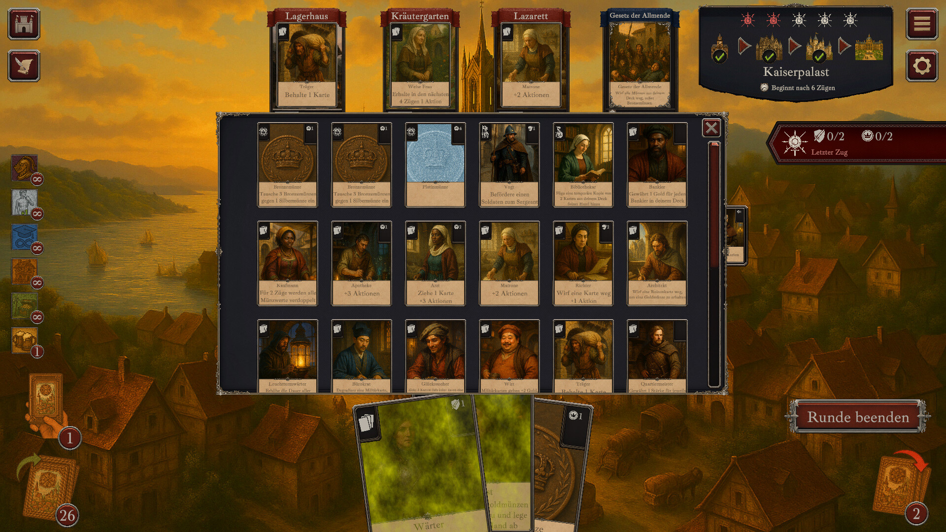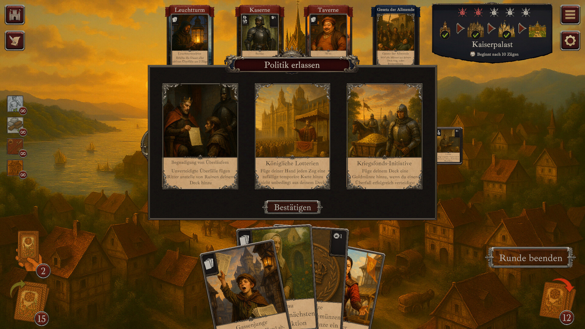 CAEMDALE ist ein Roguelike-Deckbuilder, bei dem jede Entscheidung das Schicksal deiner wachsenden Stadt bestimmt. Wenn du neue Gebäude errichtest, schaltest du mächtige Karten frei, die deine Strategie prägen. Sorgfältig ausgewählte Staatspolitiken bieten tiefere Synergien mit deinem Deck und ermöglichen neue Kombinationen.