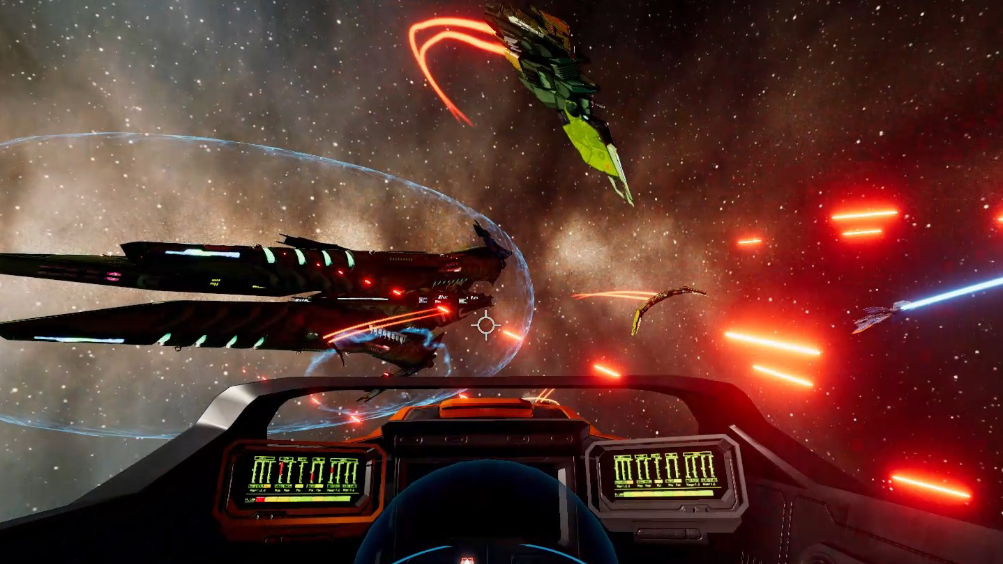 Onboard your carrier, you can chat with fellow pilots and attend your mission briefing. Then you rocket into space, fly your mission, and return home. All of this is presented as a seamless continuous experience with no load screens, transitions, or cutaways.