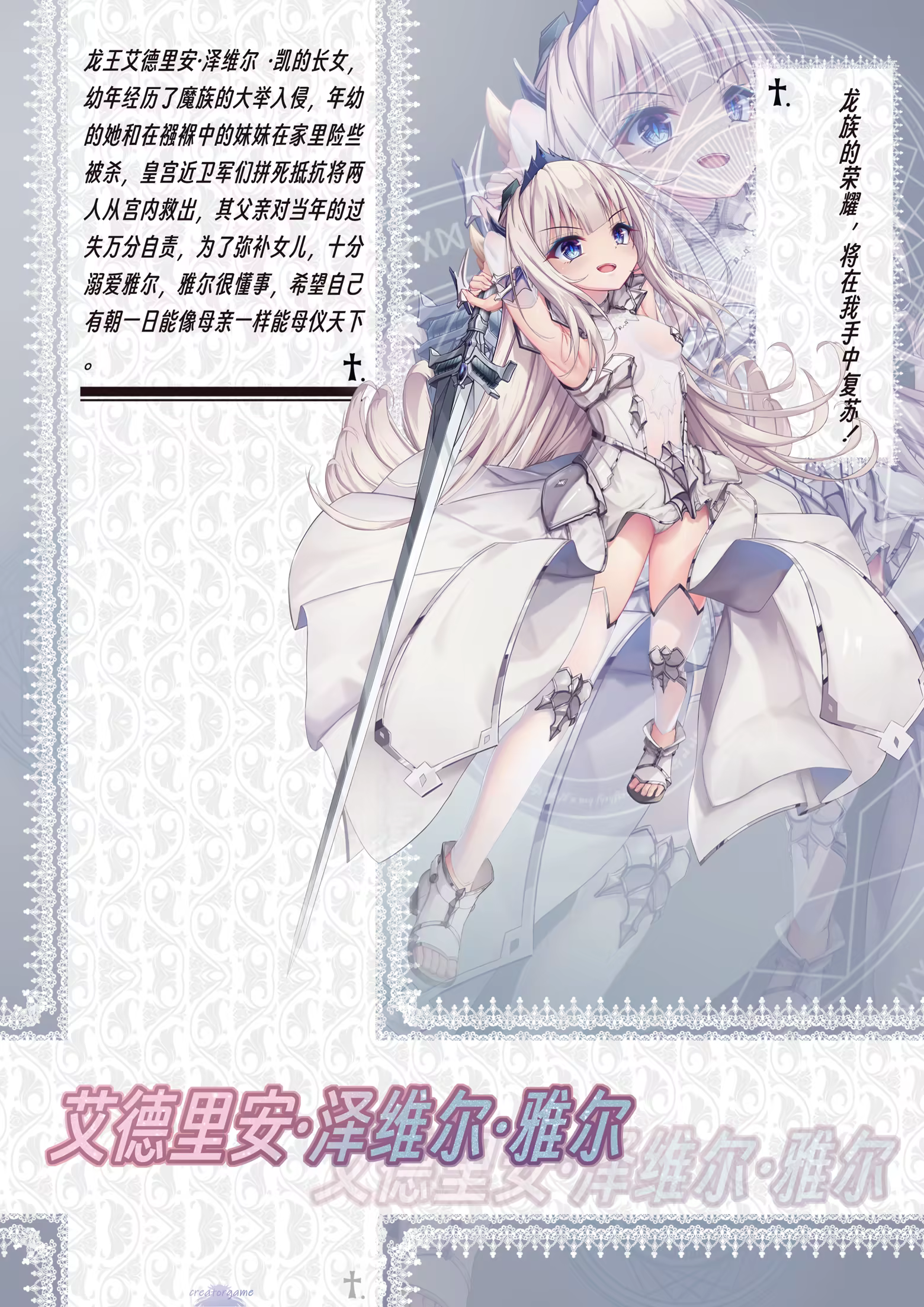 Yaer’s little sister. She was still an infant during the war eight years ago and cannot yet comprehend the events of this world. She doesn’t understand why everyone wears worried expressions, why people come and go so hurriedly, why her father forbids her from going outside, or why her mother hasn’t returned.