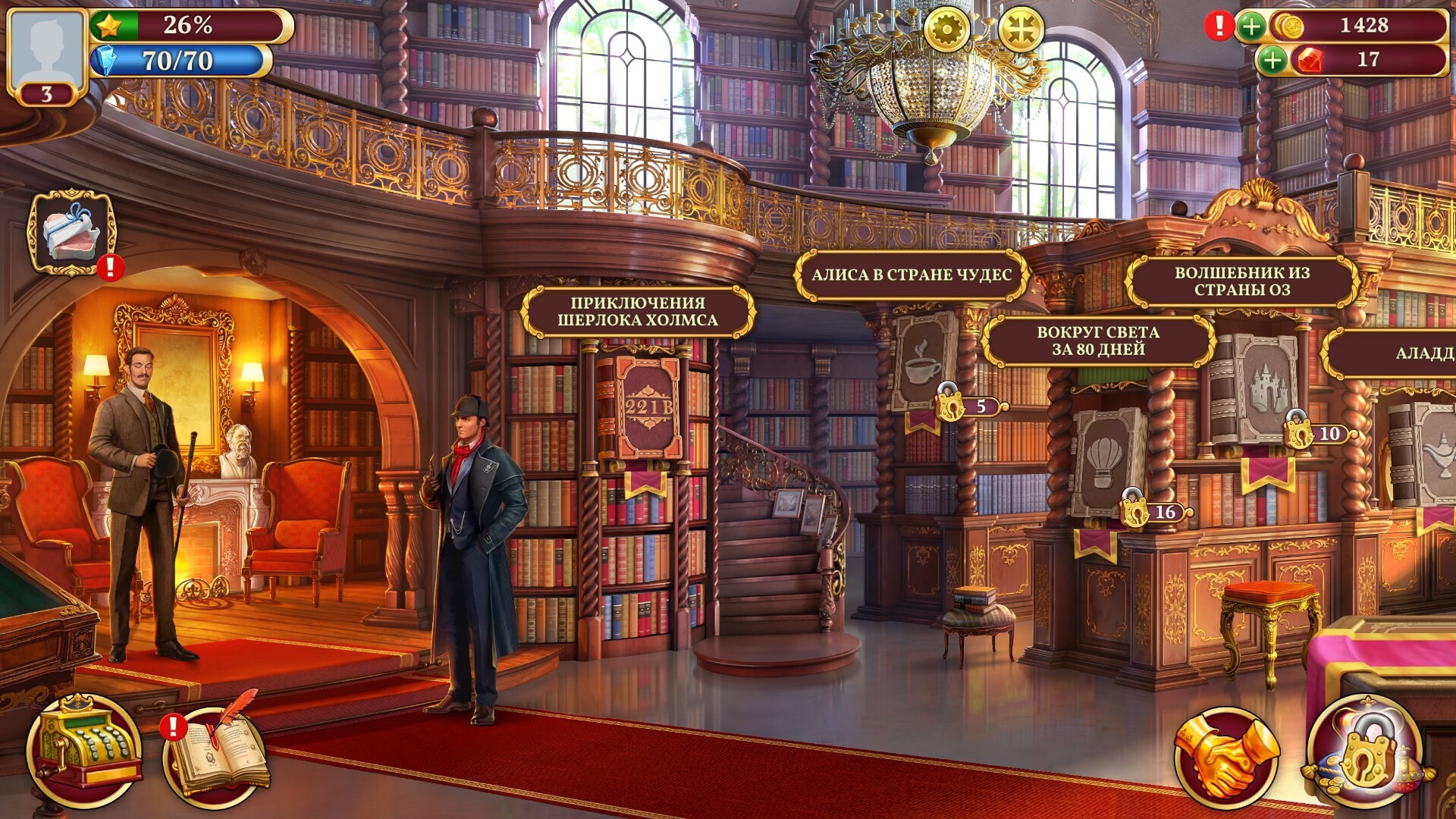 • Путешествуйте по величественной центральной библиотеке, где каждая книга — это начало нового дела по мотивам известных произведений мировой литературы