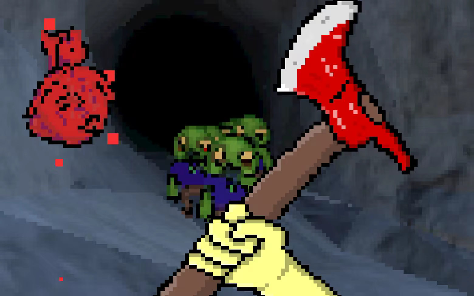 There is cartoony gore and violence, drawn with pixelart. There are weopns and melee attacks that show the player blood and body parts, but nothing realistic.