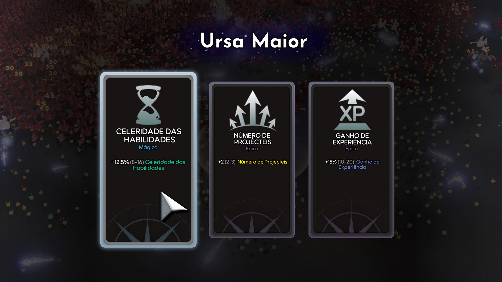 Enfrenta hordas infinitas em desafios lançados pelas constelações. Melhora as tuas habilidades, apanha relíquias e cria builds absurdos ao estilo roguelite! Redescobre a fantasia por trás de hack and slash e bullet heaven. Conseguirás sobreviver ao Survivor-like mais repleto de monstros?