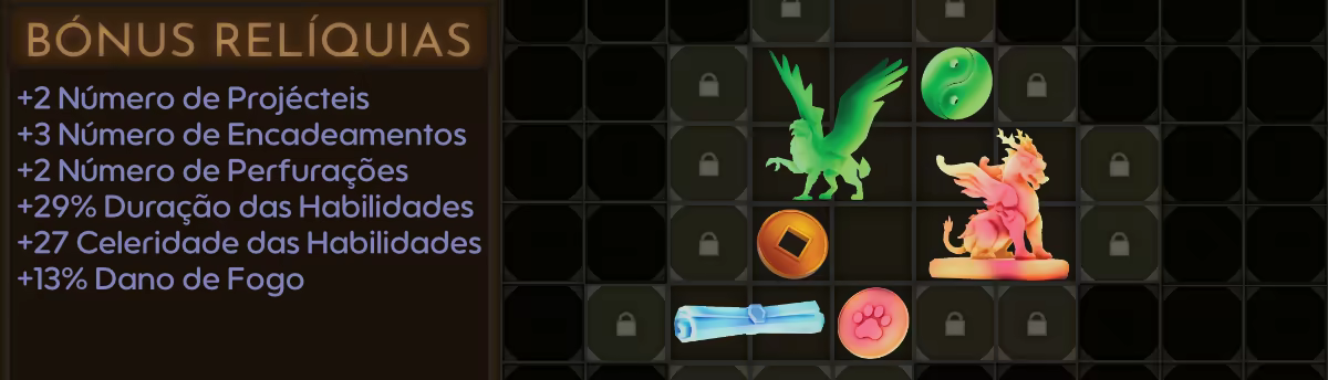 Cada Relíquia concede atributos: desde projéteis adicionais globais, a mais perfuração, saltos em cadeia, dano extra e muito mais.