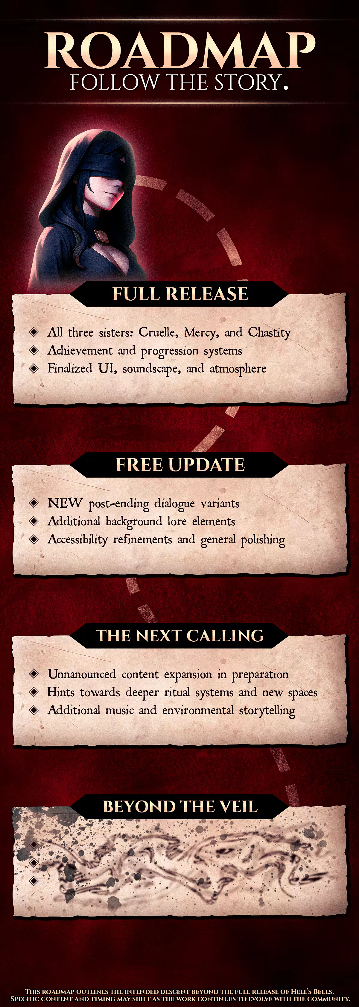 Hell's Bells is an erotic visual novel with a focus on submission, ritual, and temptation. Set within the walls of a towering cathedral far beneath the surface, you'll encounter three dominant figures, each with their own methods of control, punishment, and reward.