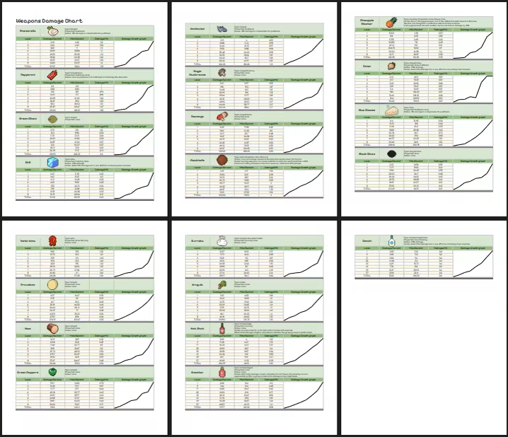 Weapons (Toppings and Sauces) damage progression and chart. This shows damage progression for each of the 8 levels of each weapon, more specifically it shows damage per second, hits per second and damage per hit along with a very convenient damage growth graph. This also shows weapons specifications: Type (Ranged, Area, Ray, etc.), Properties (Pushback, Freezing, Burning, etc.) and more.