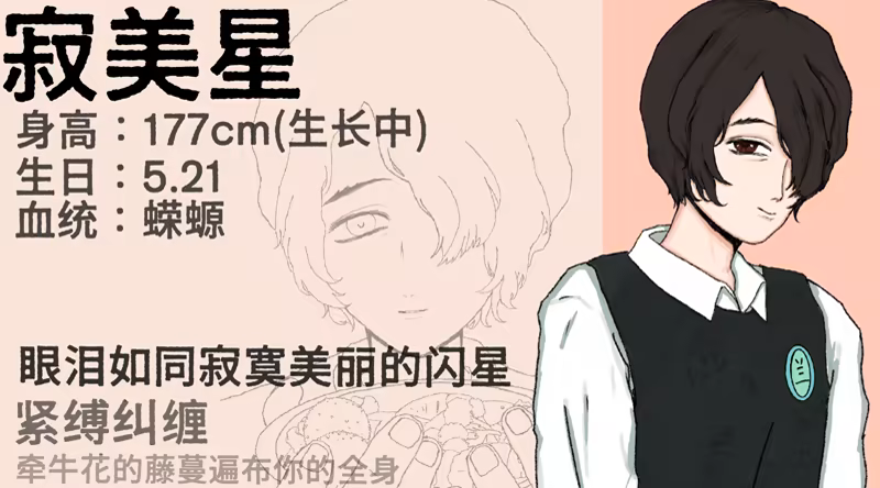 Meixing  Ji- He’s an orc with salamander-like abilities and can transform quite a bit. He’s a rich kid who just transferred to Orchid Middle School. His family doesn’t seem to care much about him, so he’s pretty quiet and shy. But don’t underestimate him—he’s incredibly persistent when he sets his mind on something. Once he latches onto you, it’s hard to shake him off. Kind of like morning glory vines that won’t let go unless... well, you know.