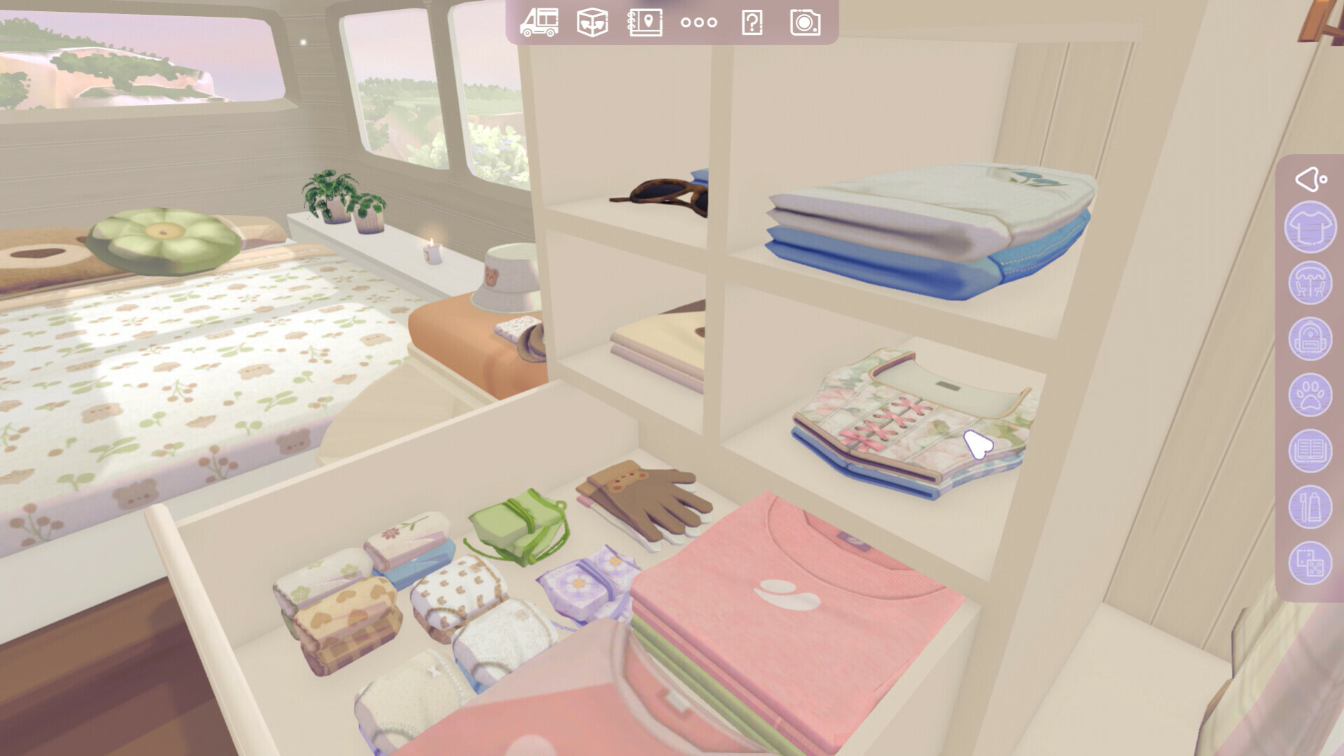The journey starts with a totally empty van in a charming destination. In the process of camperizing, it will be possible to add as much furniture as space allows. Once furnished, the goal will be to store and sort all the traveler's belongings, which will be available in a pack list. Not only is it possible to decorate the space inside the van, but also the exterior is customizable.