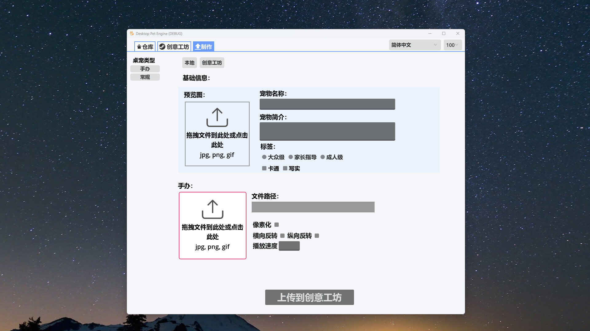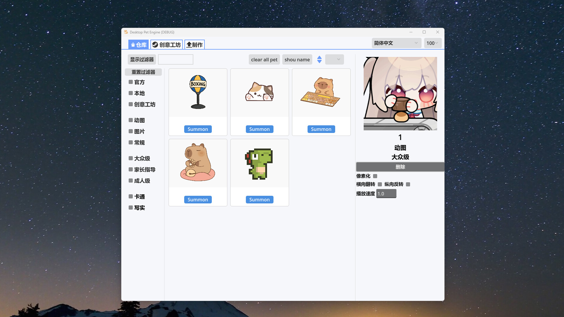 游戏的核心玩法是利用自己喜欢的素材制作各种类型的桌宠,当然也可以从创意工坊中下载别人分享的桌宠