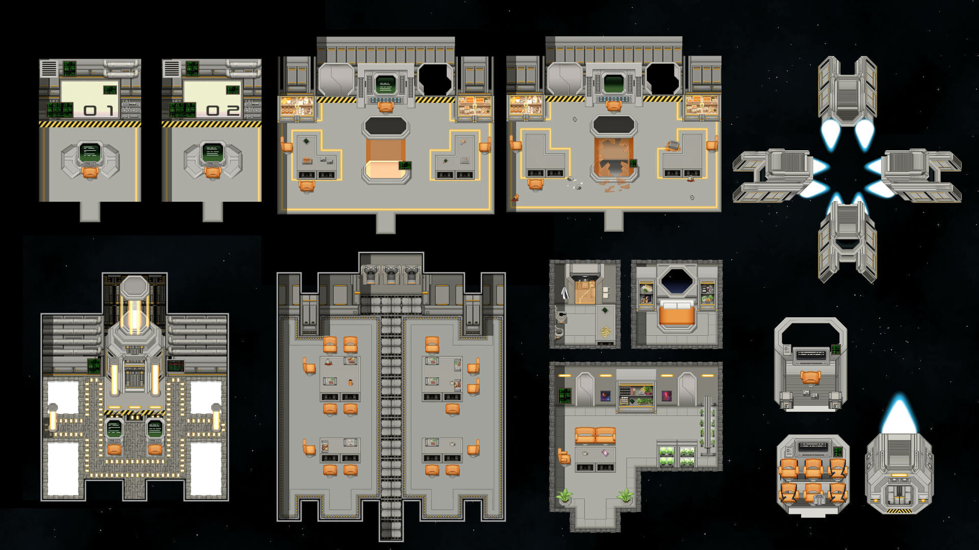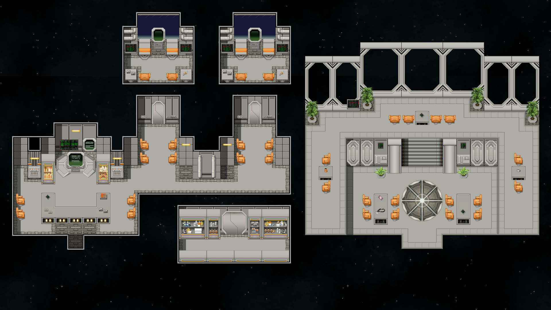 Attention astronauts! Get ready to search the stars in style with the KR Retro Starship Tileset! Kokoro Reflections has created the perfect MV/MZ-sized tileset to fill your sci-fi game with cold steel walkways and orange highlights. Build cargo ships run with a small crew, science ships setting off to learn about distant planets, passenger ships where function rules over form, and more with this pack! A1, A2, A3, A4, A5, and 4 B sheets cover exterior and interior tiles to make full spaceships. Give your players an overview of the ship with an exterior establishing shot that shows where different vents and airlocks are, and switch to the bridge map with a large octagonal window looking out at the stars and computer stations tracking the ship’s current location and possible threats. Create claustrophobic hallways with grate floors that lead to the med bay with its shelves of books and medicines, the science lab with leafy greens growing in hydroponic units, and small crew bedrooms where beds and small shower units offer reprieve from the dirty work of moving crates and maintaining the ship’s equipment.