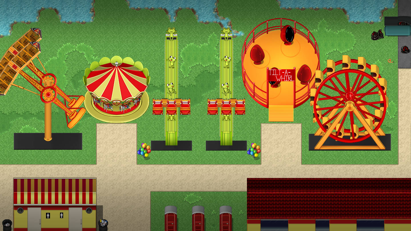This pack also includes 5 character sprites for doors and bathroom stalls so your heroes and NPCs can have some privacy, along with 10 sprites of rides and more to add spinning and twirling fun to your maps! Have a ticket booth with swinging gate keep your players from rushing onto rides before buying tickets, and decorate the paths with bouncing balloons that lead your heroes to a massive merry-go-round, towering ferris wheel, whirling pendulum ride, and spinning tilt-a-whirl where they can have fun and maybe even gain a stat buff. Pick up the KR Amusement Park Tileset and build a carnival where anything can happen!