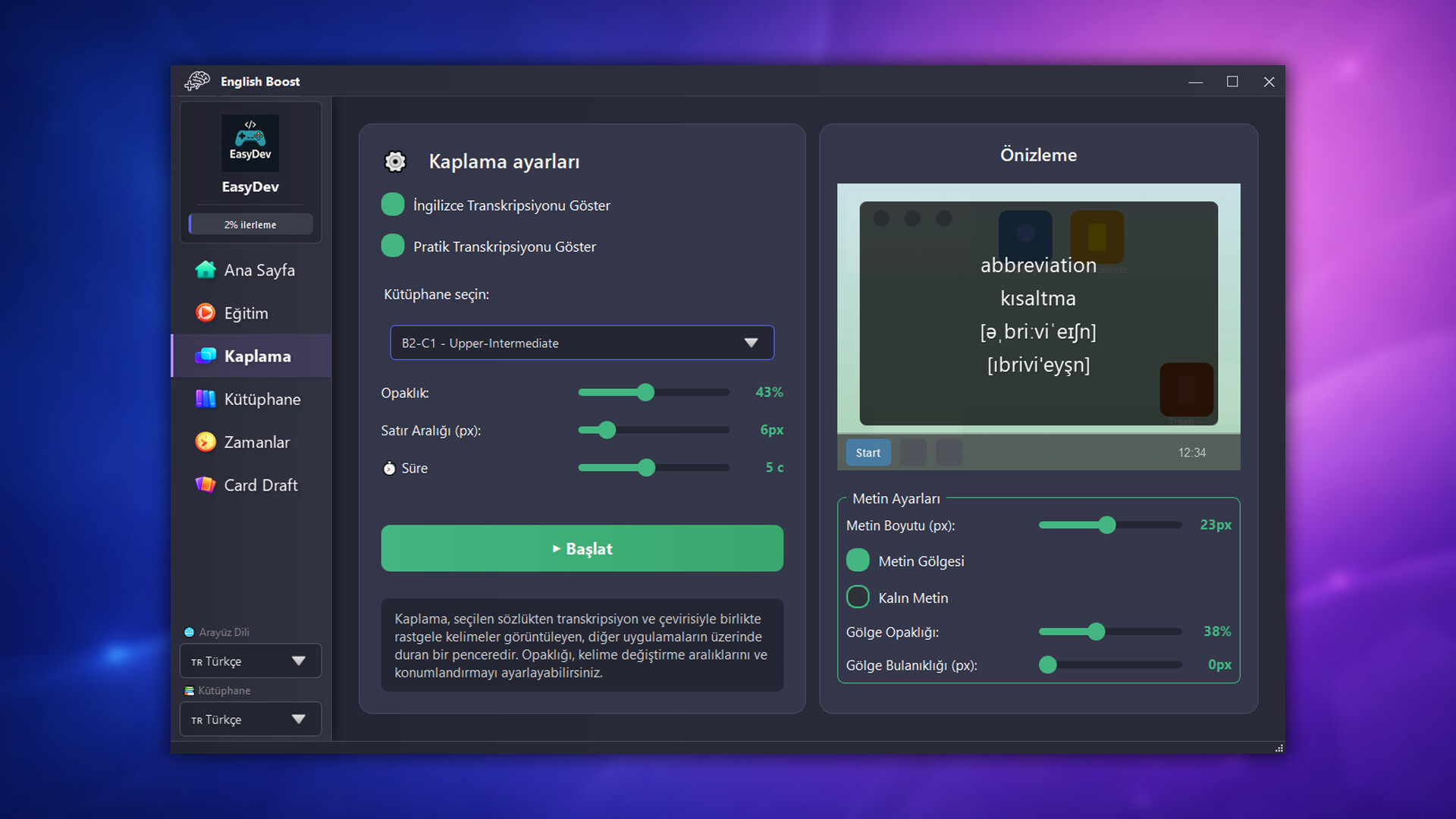 Kelimeler herhangi bir uygulamanın üzerinde görünür ve zamanla hafızana yerleşir.