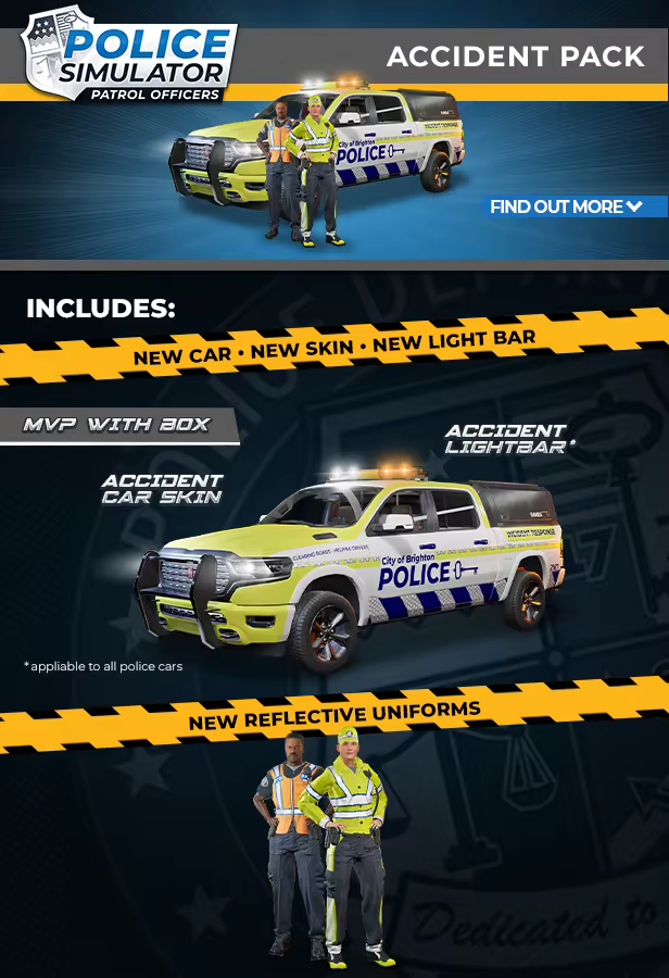 Zadbaj o to, aby wszyscy cię widzieli i przygotuj się do akcji — przedstawiamy pakiet Accident Pack! W tym dodatku DLC znajdziesz wszystko, czego potrzebujesz do zabezpieczania miejsc wypadków: odblaskową odzież, pomarańczowy pasek świetlny do pojazdów, radiowóz Multipurpose Responder Vehicle wyposażony w obszerniejszy bagażnik pozwalający przewozić więcej narzędzi oraz skórki pojazdów policyjnych, dzięki którym wszyscy dowiedzą się, że sprawujesz kontrolę nad miejscem zdarzenia.