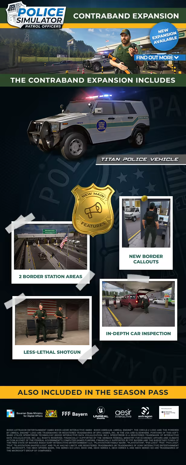 The Contraband Expansion adds a new dimension to Police Simulator: Patrol Officers. Staff shortages at the border mean that your precinct must step in to secure two fully operational stations connected to the highway. Inspect documents and control the traffic with CCTV and spike strips. When suspicion arises, conduct secondary checks by searching vehicle trunks, interiors, and engines for contraband. Use sophisticated equipment like the biometric kiosk, inspection mirror, and substance analyzer, and use a less-lethal shotgun to detain suspects safely. Take the wheel of the rugged Titan Police SUV – built for pursuit and control. Expect dynamic situations such as NPCs attempting escapes that result in foot or vehicle chases that escalate with the Highway Patrol DLC. Border towers, binoculars, and fence systems allow you to monitor for trespassers and to manage security. Seamlessly integrated with city patrols, these features enrich your career with more variety, authenticity, and greater challenges.