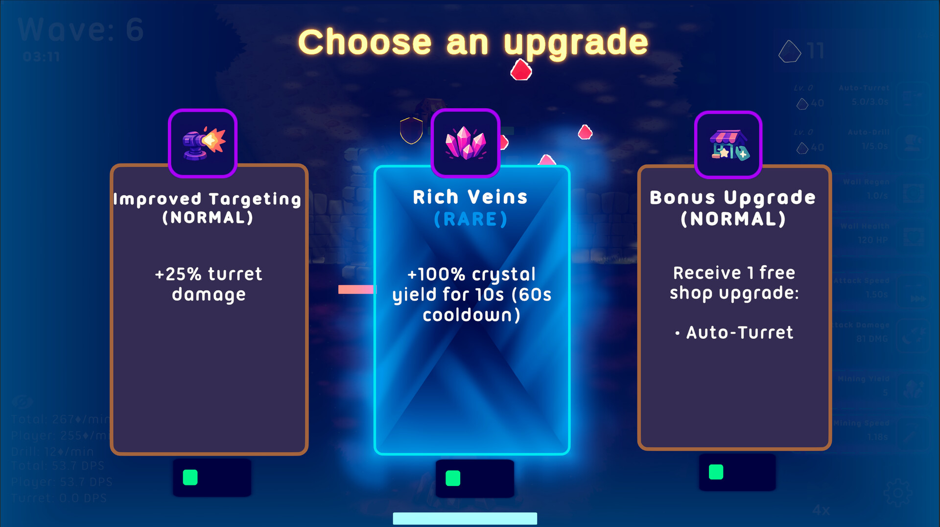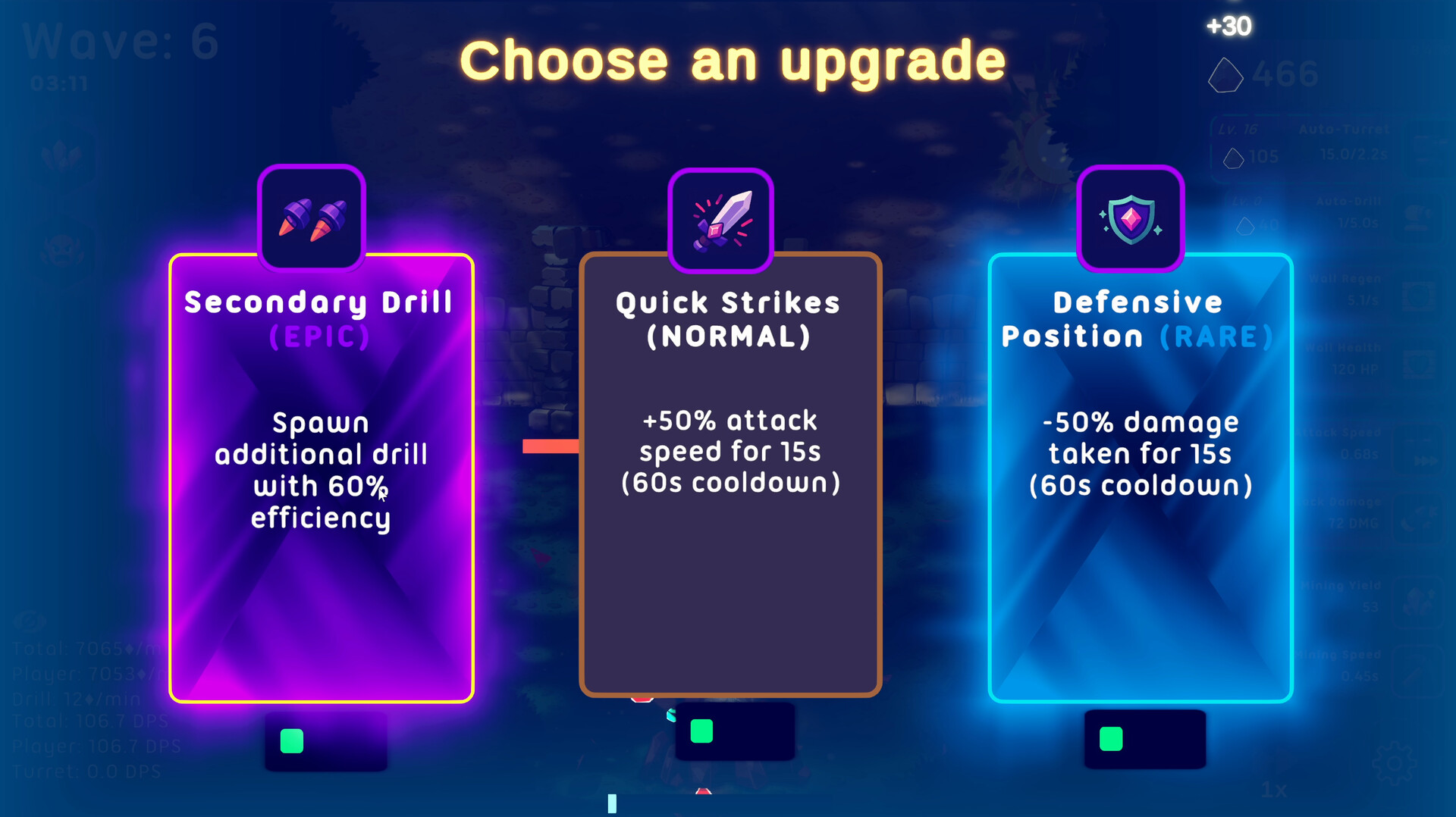 Every few waves, pick from three random permanent upgrades that shape your strategy. Will you become an unstoppable warrior who barely needs walls? A mining tycoon with impenetrable automated defenses? Or find your own path to survival?