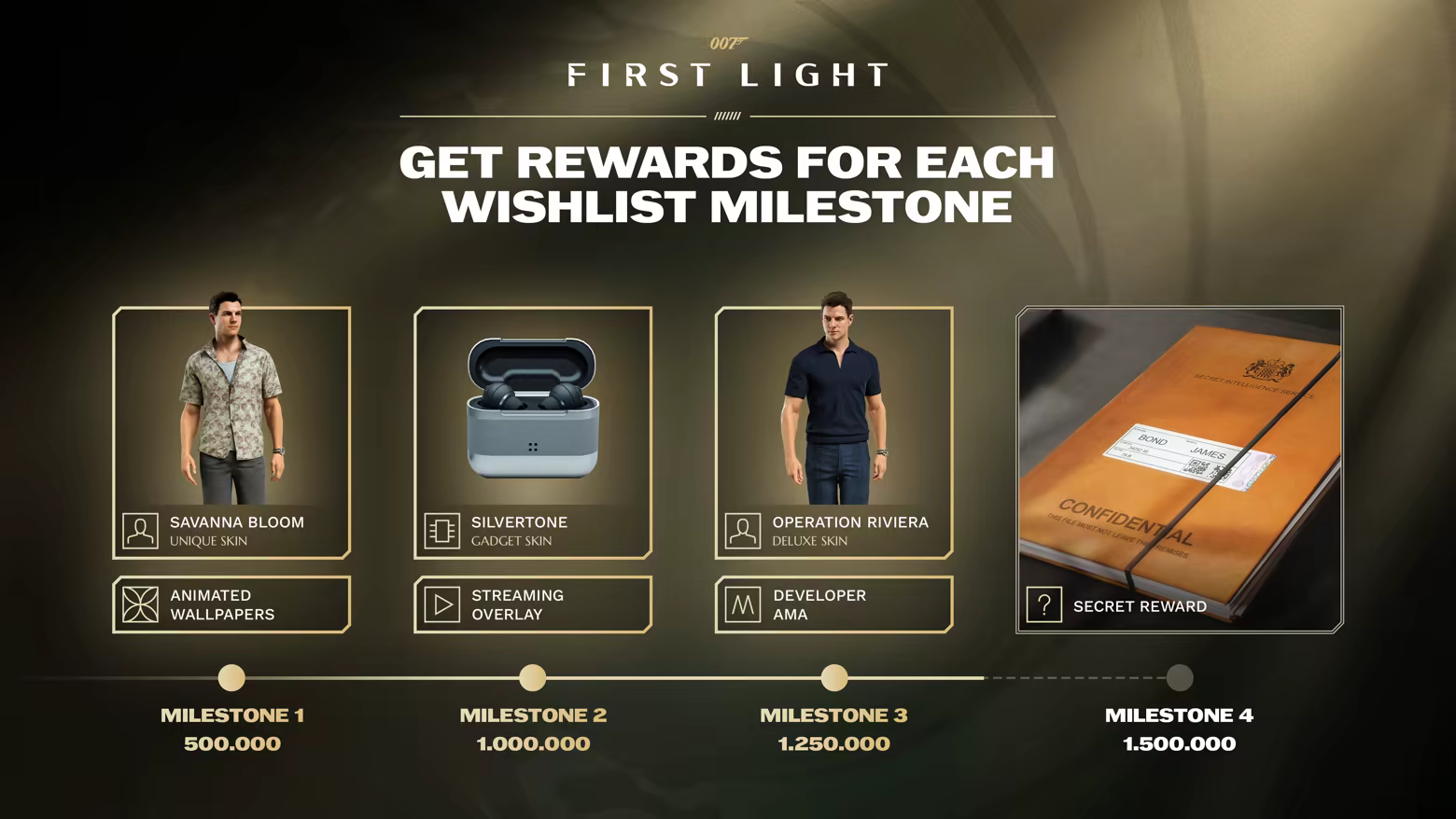 The mission is simple: rally together and unlock the wishlist milestones for 007 First Light. With every milestone reached, new in-game and community rewards are unlocked, adding style, sophistication, and a secret reward.