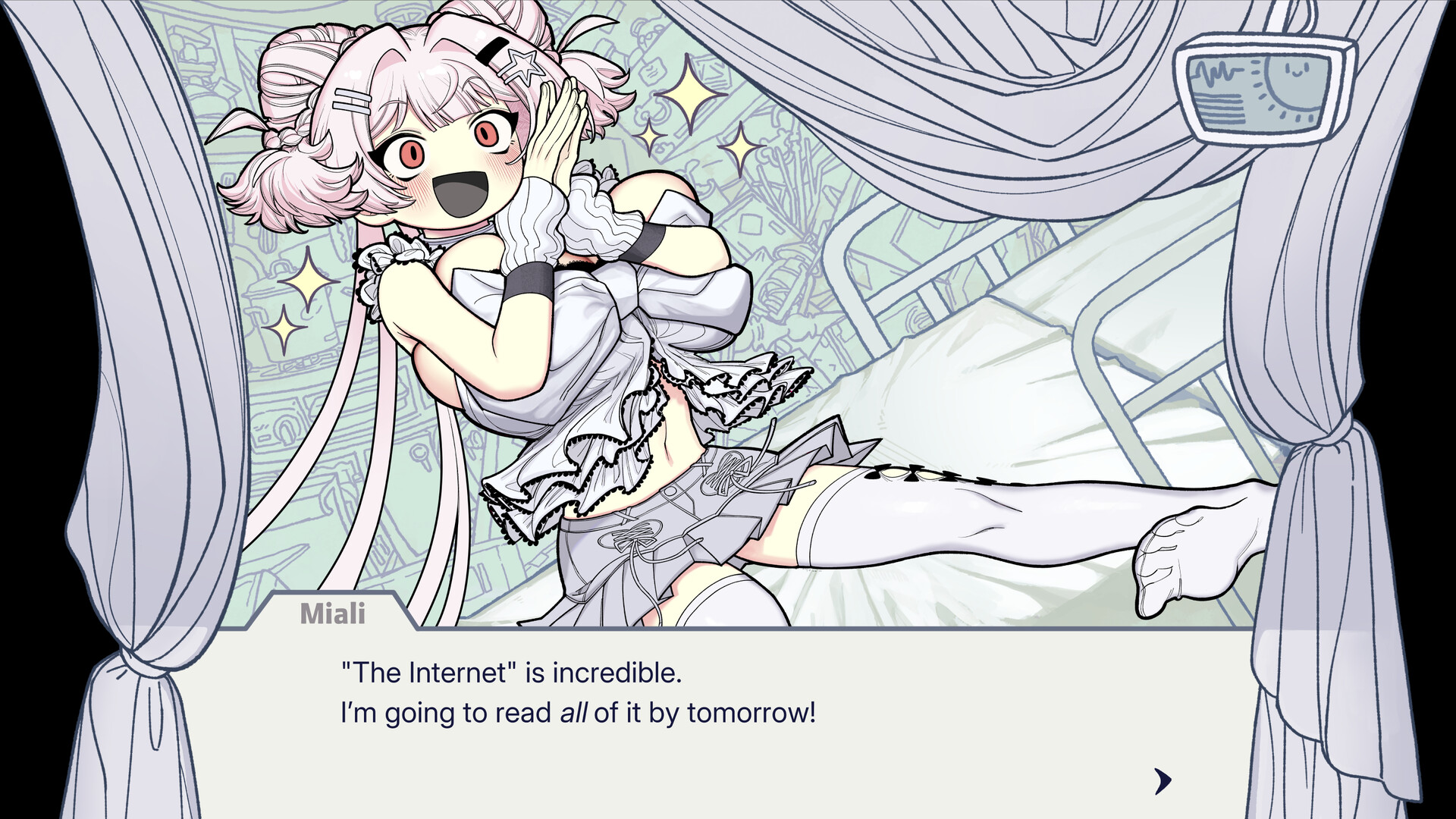 Branch the story with a single click. Your choices guide Miali’s staged evolution.