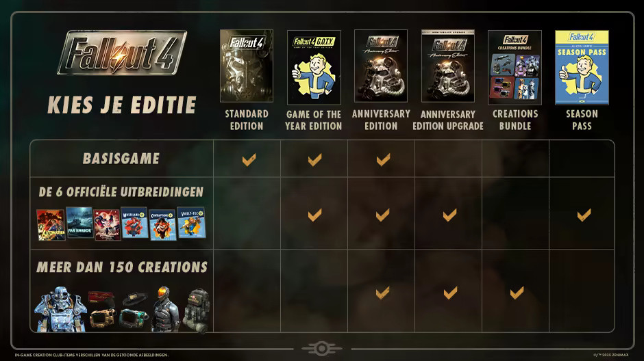 Plus ruim 150 Creation Club-voorwerpen, met unieke wapens, power armor-sets, gebouwenpakketten, kleurenschema's, unieke huizen en zelfs de mogelijkheid om Dogmeat van hondenras te veranderen, waarmee je jouw reis door de Commonwealth nog verder verrijkt.