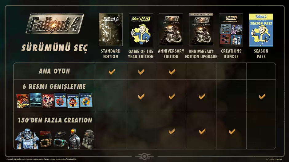 Ayrıca 150'den fazla Creation Club eşyası, benzersiz silahlar, Power Armor setleri, inşa paketleri, boyalar, eşsiz evler ve hatta Dogmeat'in farklı cins olarak görünmesini sağlayan seçeneklerle Commonwealth'teki yolculuğunu zenginleştir.
