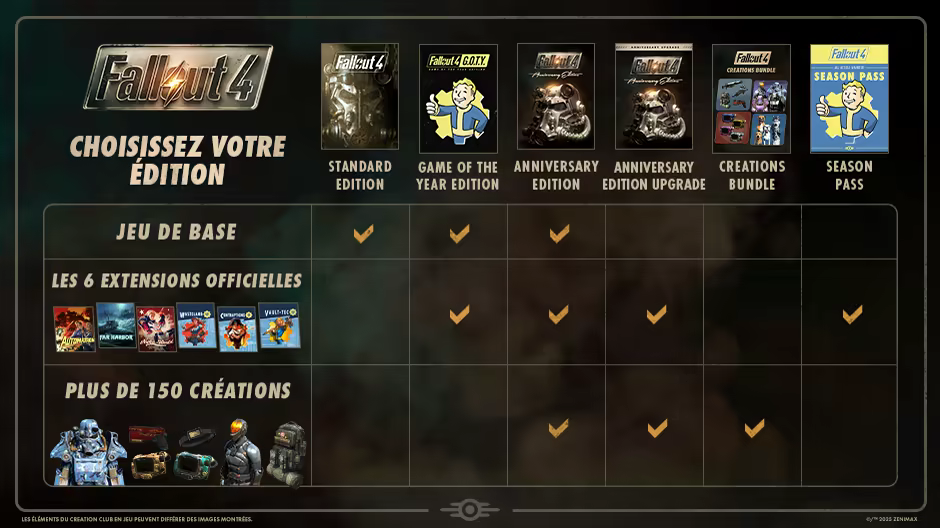 Sans oublier Plus de 150 éléments du Creation Club dont des armes uniques, des ensembles d'armure assistée, des packs de construction, des peintures, des habitations inédites et même la possibilité de donner à Canigou l'apparence d'une autre race... tout le nécessaire pour enrichir votre voyage à travers le Commonwealth.