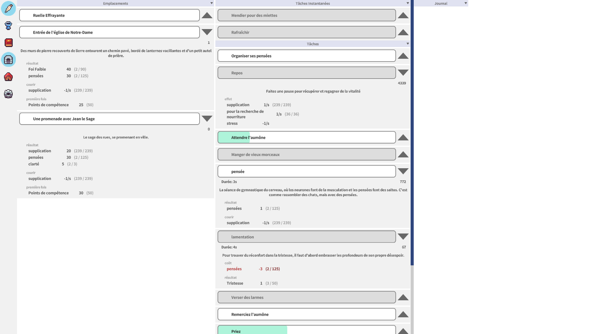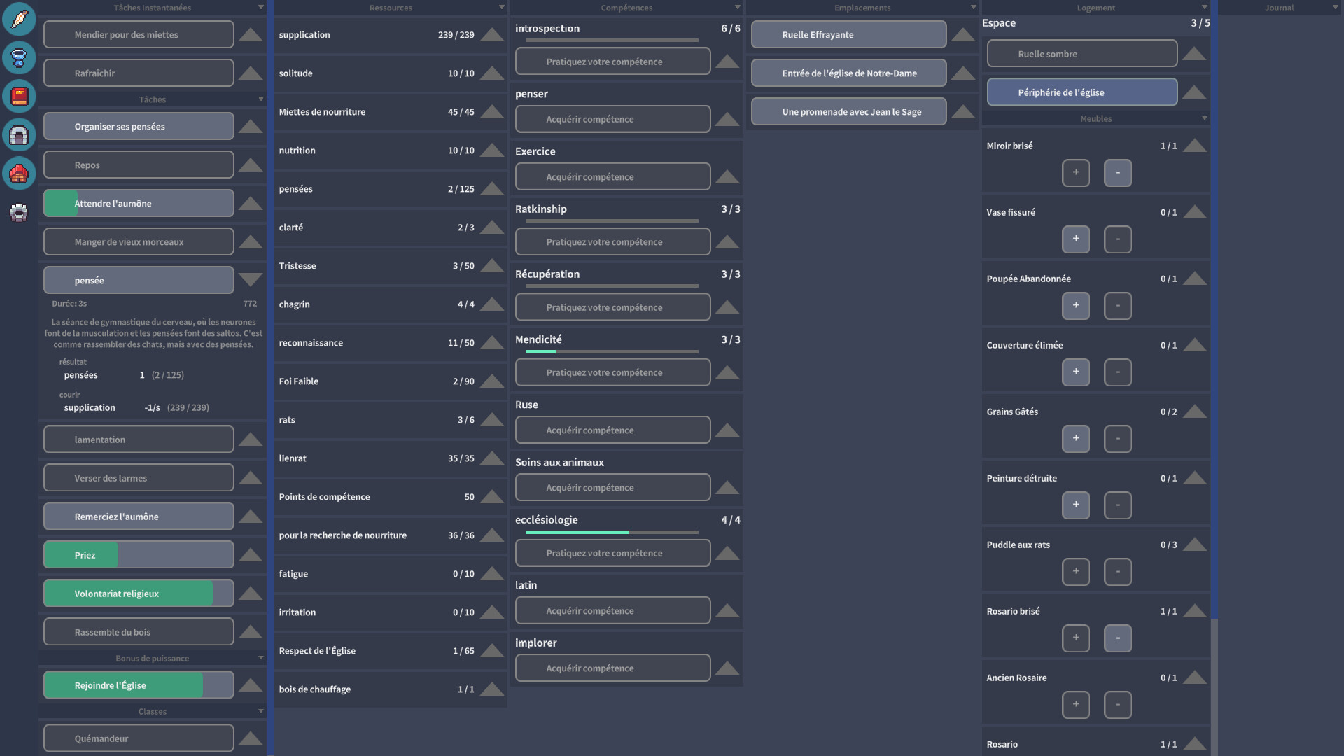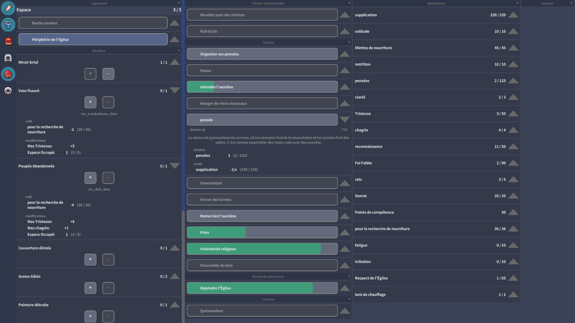 • Accumulez toutes sortes de choses : Il y a de nombreuses ressources à rassembler, et de nombreuses façons de les obtenir. Mendez de la nourriture, fouillez des bibelots, priez pour le pardon, imaginez-les en étant. Les ressources peuvent être concrètes comme des miettes de pain, vivantes comme des chats, ou abstraites comme la tristesse et la gratitude.