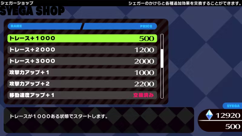 クリア後に使用できるシェガーショップやスーベニアで使用できるシェガーをゲーム起動時に5000獲得します。