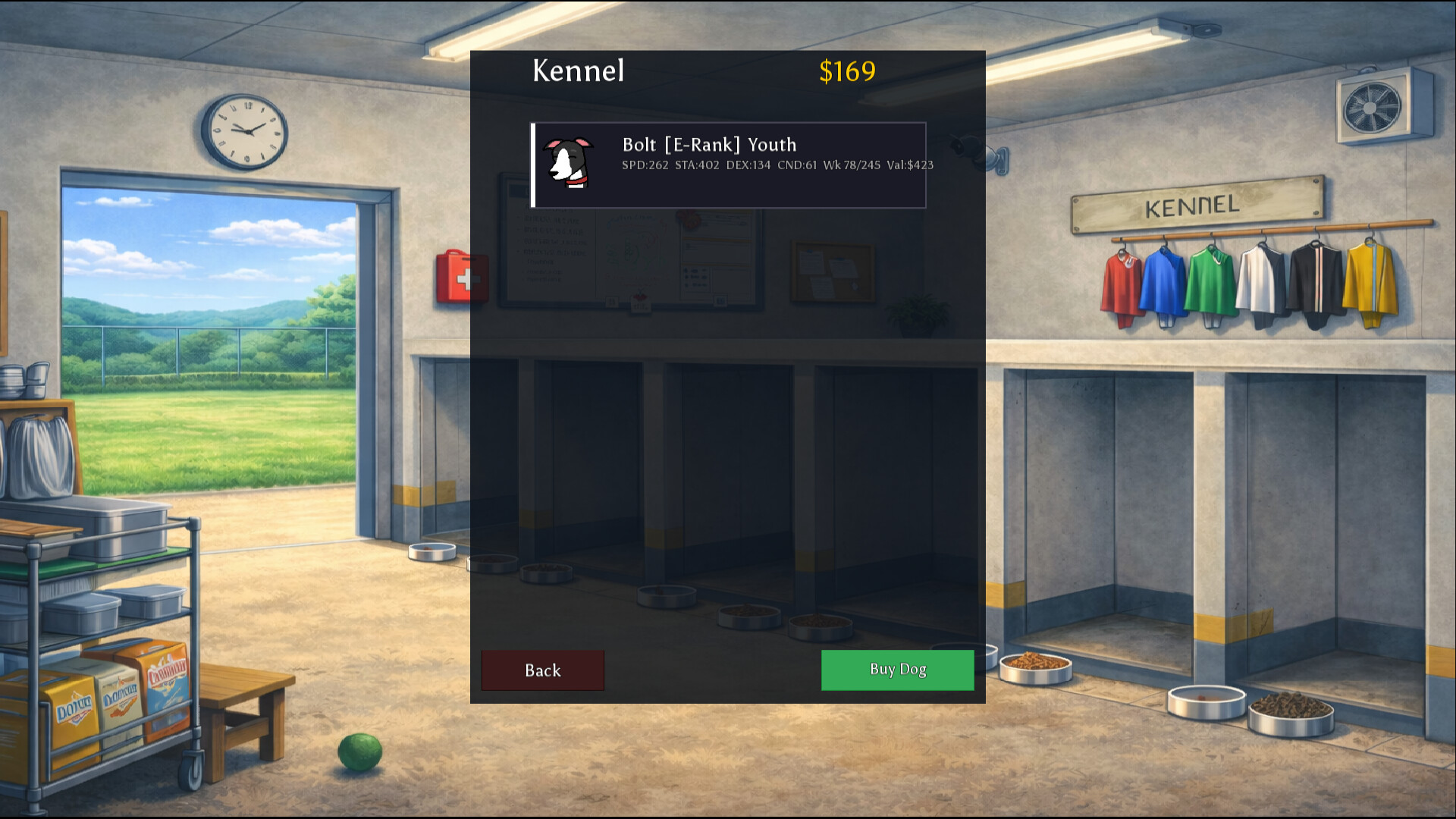Manage your dog racing kennel in this management sim. Carefully craft you routine for training , hire the best staff and work your way from bottom of E-Rank to Champion status!