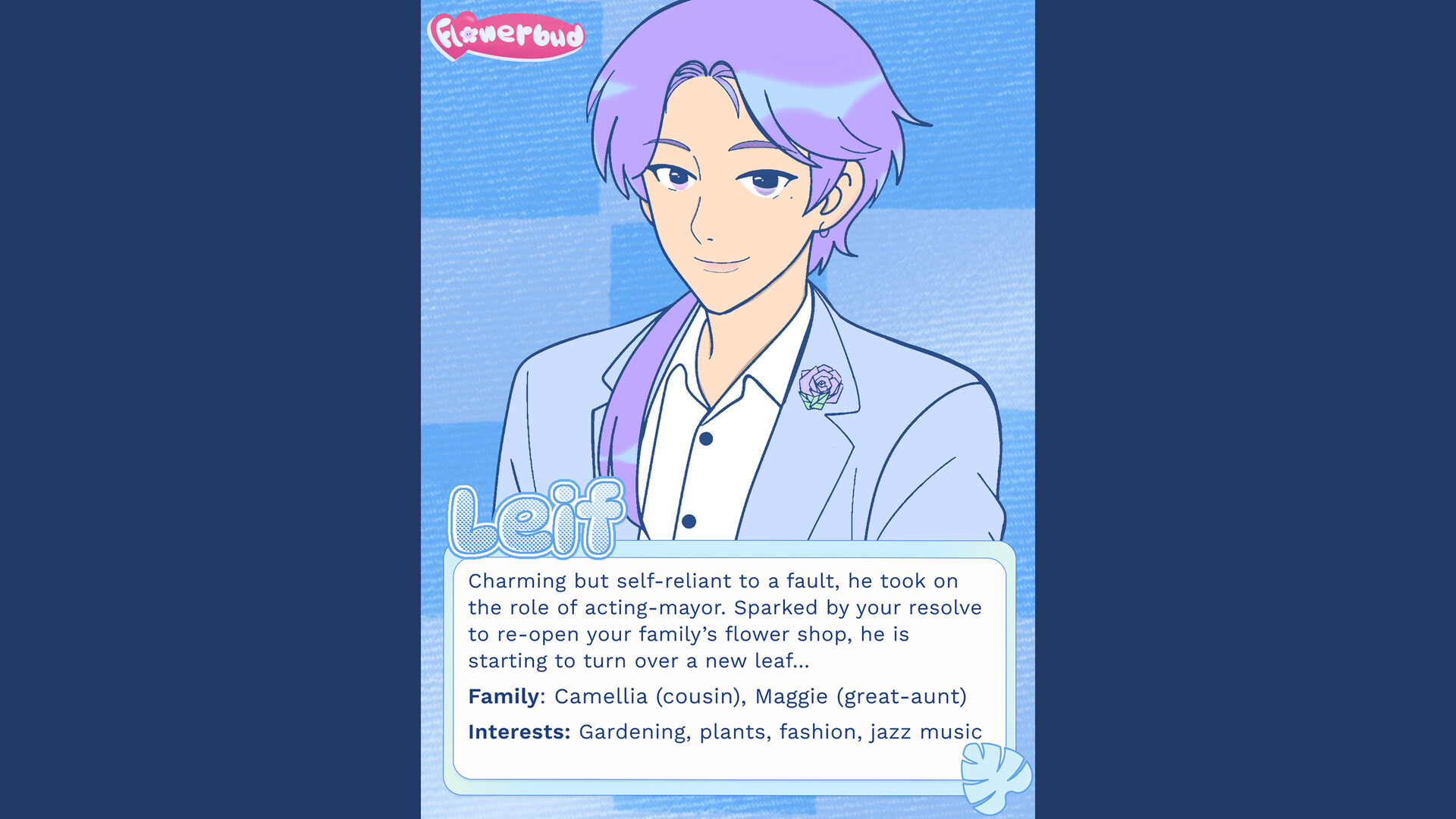 A character focused, flower shop, dating sim where YOUR choices shape the town's future.