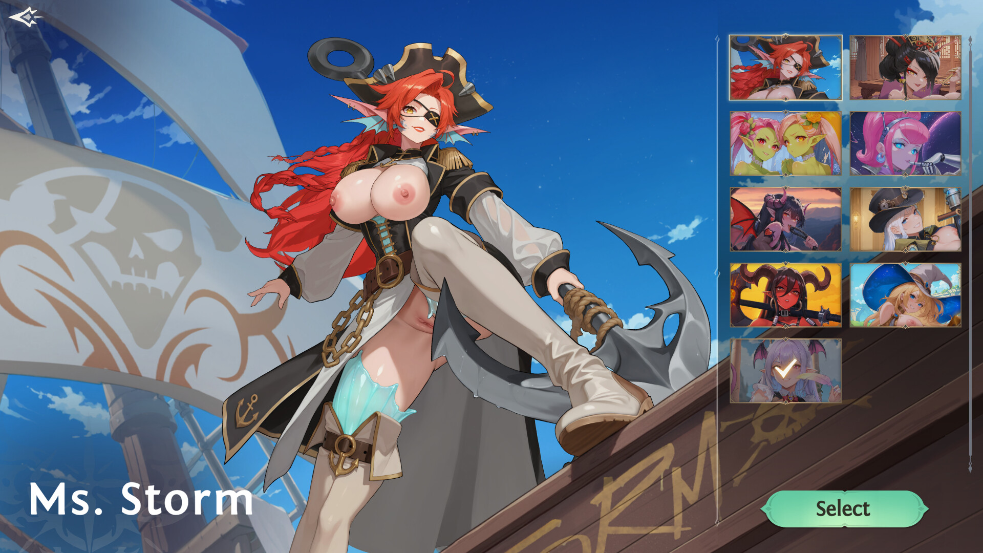 Raise the sails—Miss Storm is on the horizon! She's not just a pirate in a skirt, she's a full-blown hurricane of lust and adrenaline. Every step is bold, every glance defiant, every word sharp as her blade, and that body... It was made to conquer anyone who dares cross her path. On her hip swings more than just a sword—there's also a shiny collection of cuffs, "for those especially wild nights."
