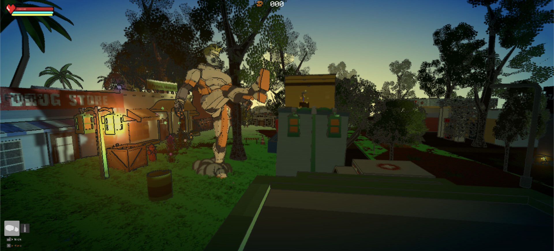 Beside exploration, combat against low poly monsters and zombies is a part of the game's survival aspect. There is blood and cartoonish mutilation (e.g arms of the zombies may disappear when shot)