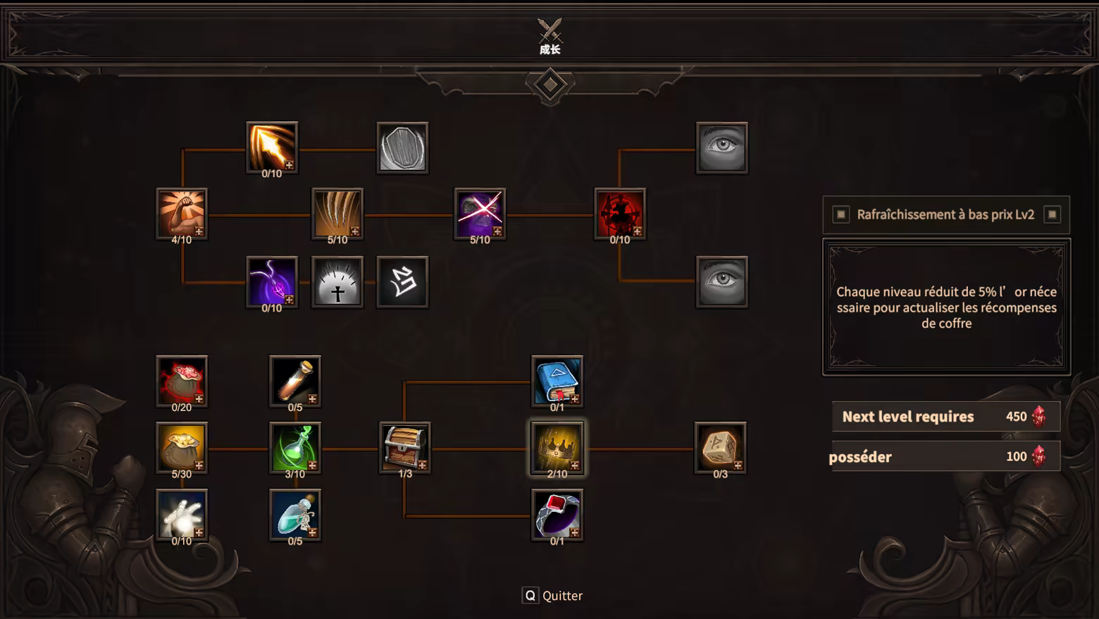 Progression hors combat — Les points obtenus lors des défis peuvent être utilisés dans le hall pour améliorer vos personnages de façon permanente.