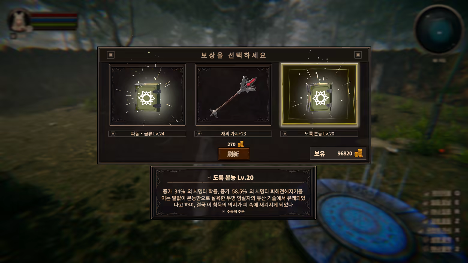 게임 내에서는 보물 상자와 상인을 통해 스킬 빌드를 조합할 수 있습니다.