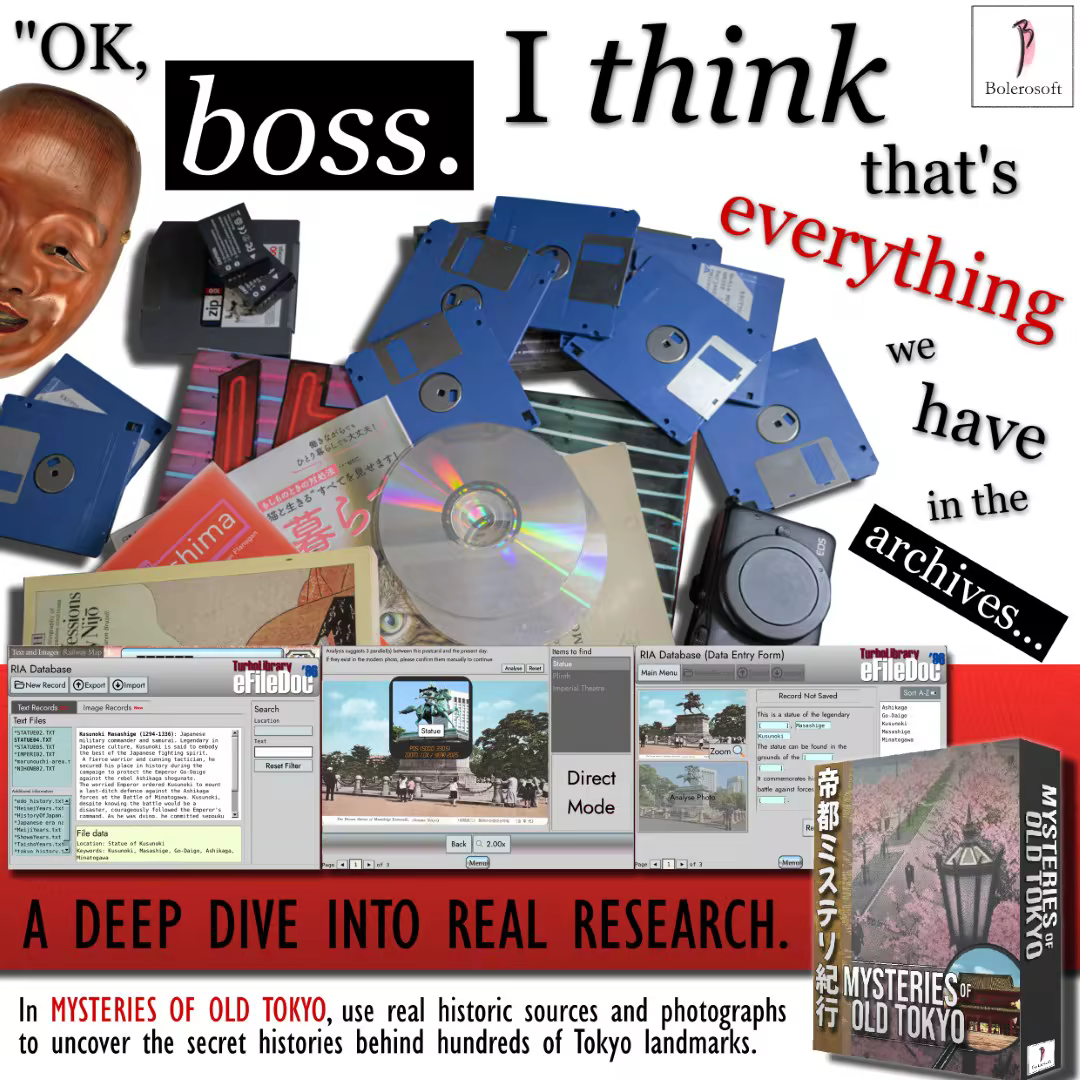 Inspired by the CD-ROM "multimedia experiences" of the 1990s like Encarta '96 and Cosmology of Kyoto, as well as modern detective games like The Roottrees are Dead and the Golden Idol series, Mysteries of Old Tokyo takes a set of postcards printed in 1930s Tokyo from the author's collection and brings them, hand-scanned, to your personal computer in full 1024x768 resolution.