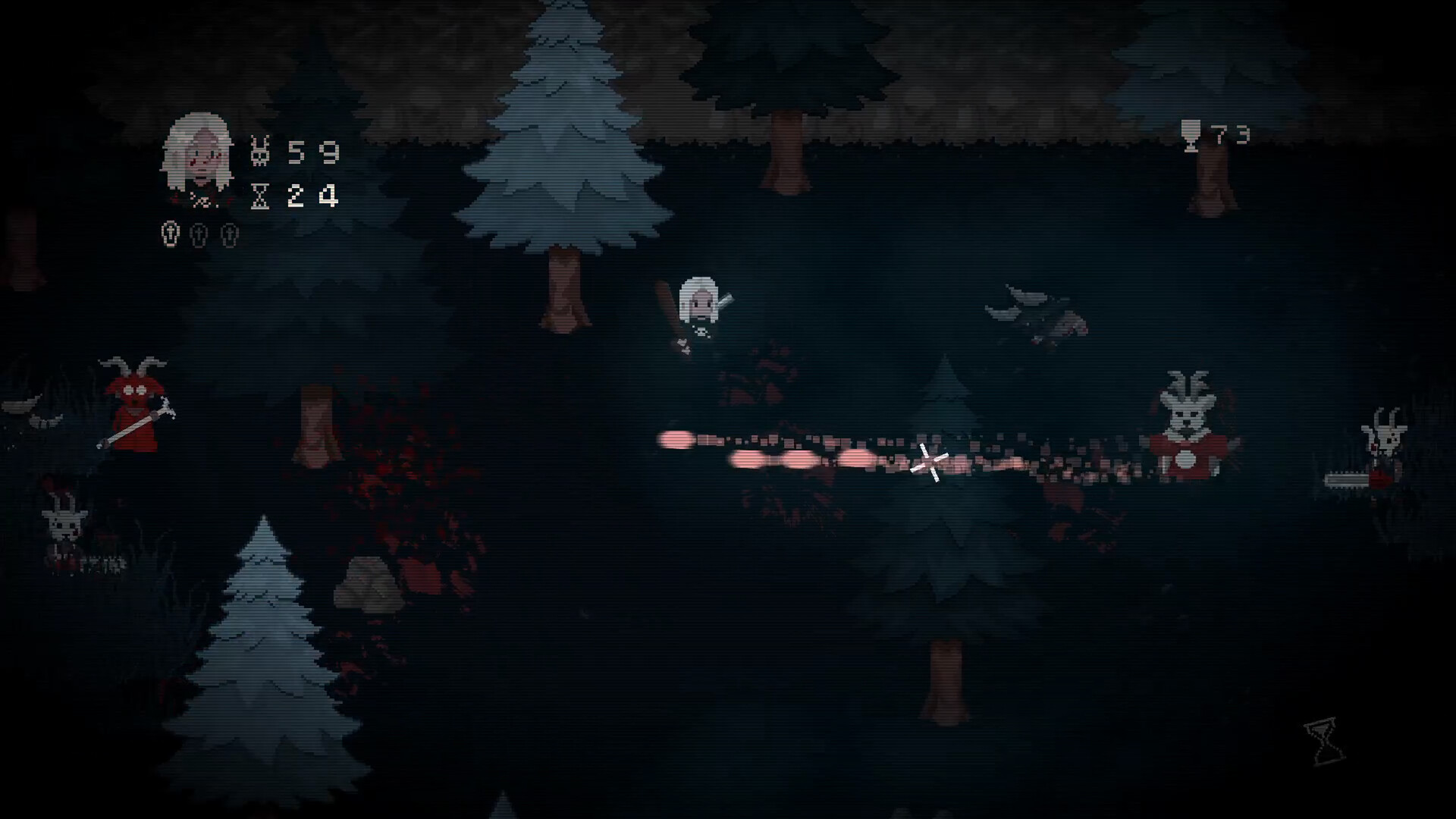 • Lead & Blood is a fast-paced arena shoot 'em up with a dark and eerie atmosphere. Take control of a bloodthirsty huntress, ready to tear cultists apart in a secluded forest clearing.