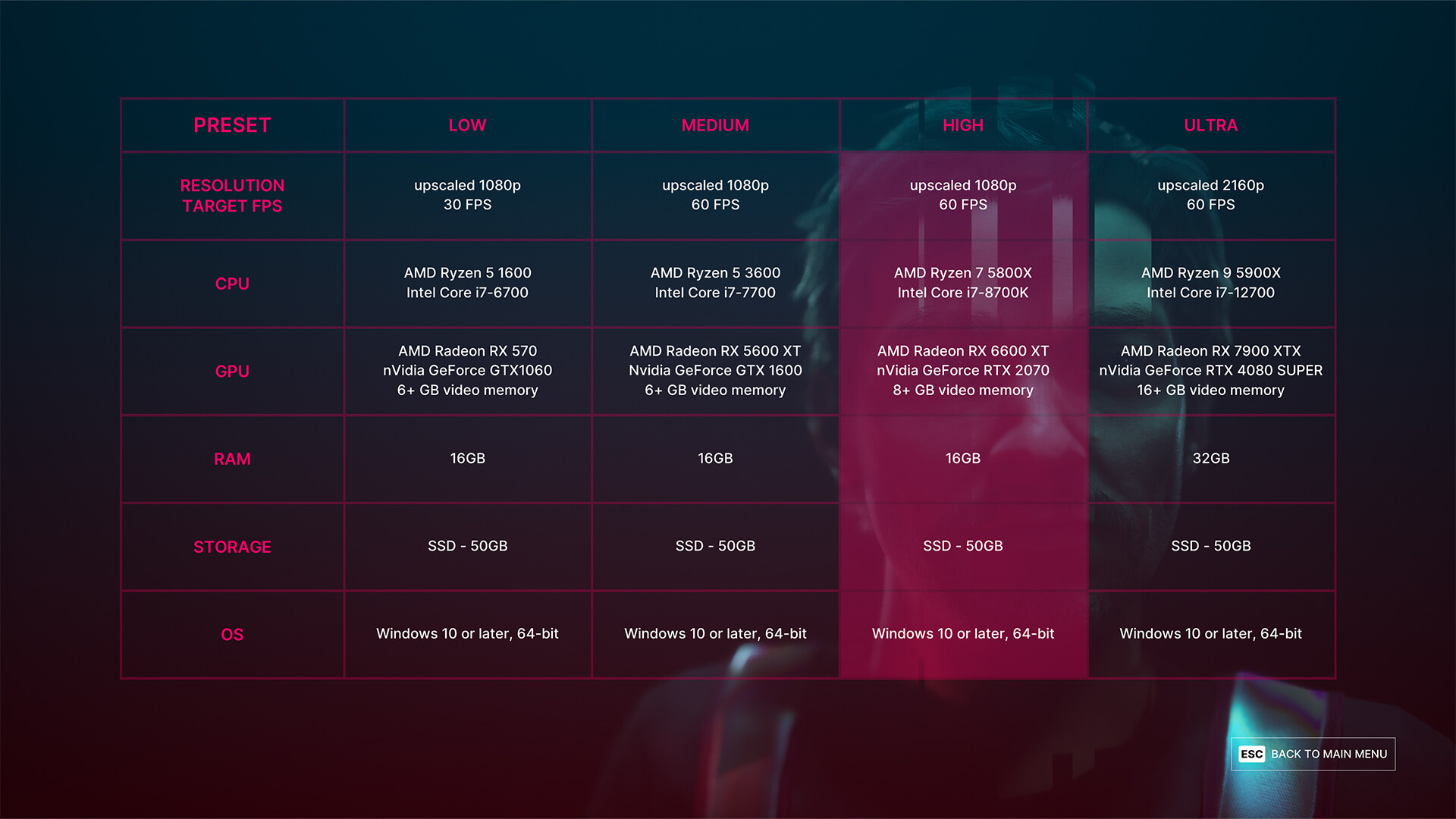 • Processor: AMD Ryzen 7 5800X, Intel Core i7-8700K