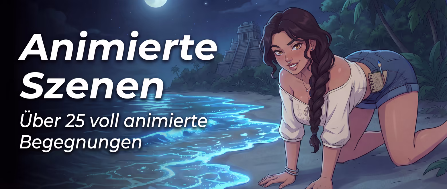 Erlebe über 25 (6 in der Demo verfügbar) sorgfältig gestaltete intime Szenen mit flüssiger Bild-für-Bild-Animation. Von Wasserfall-Entdeckungen bis zu Begegnungen am mondbeleuchteten Strand wird jeder Moment durch detaillierte Kunstwerke zum Leben erweckt, die exotisches Mysterium mit echter Leidenschaft verbinden.
