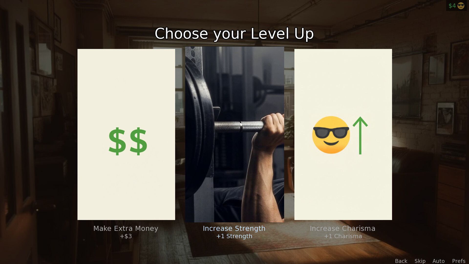 Choose your background — Construction Worker (Money💵), Personal Trainer (Strength💪), or Sales Associate (Charisma😎) — and manage your stats to unlock unique dialogue options. Between dates, decide: work extra shifts for cash, or invest in self-improvement? Your stats directly influence how each woman responds to you.