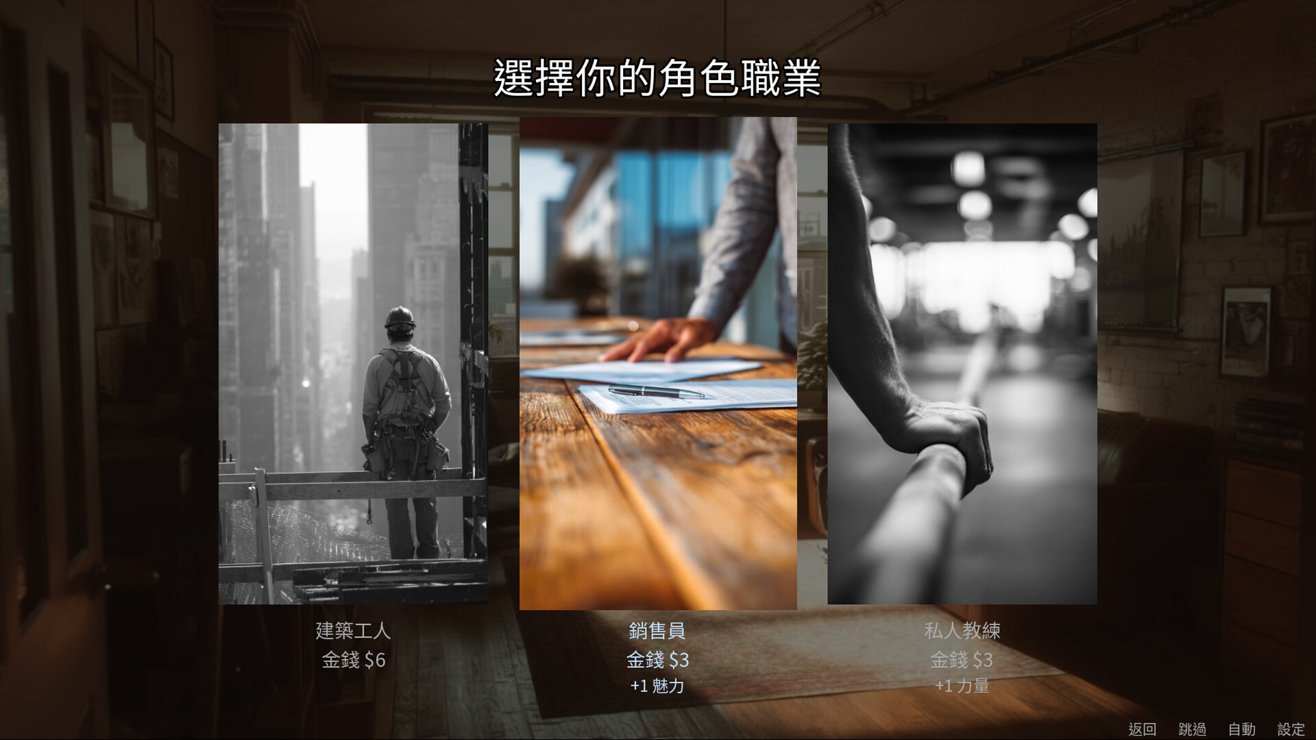 選擇你的背景 — 建築工人(金錢💵)、私人教練(力量💪)或銷售員(魅力😎)— 管理你的屬性來解鎖獨特的對話選項。在約會之間做出決定:加班加點賺錢還是投資於自我提升?你的屬性直接影響每位女性對你的反應。