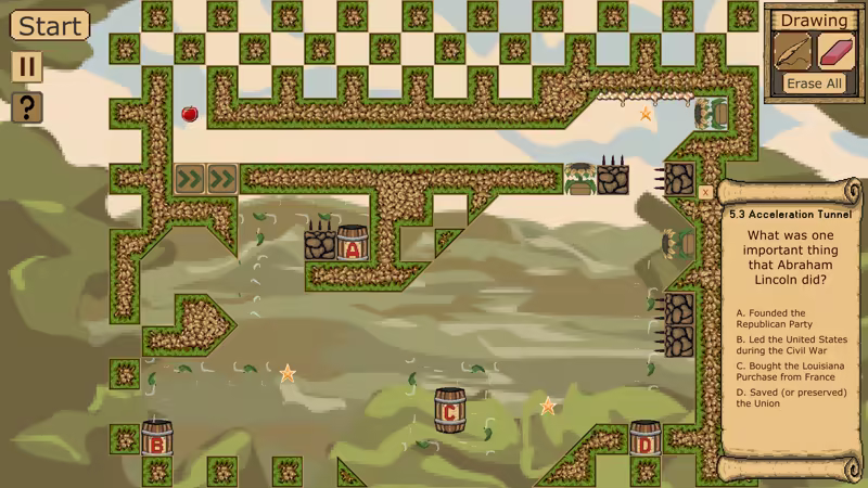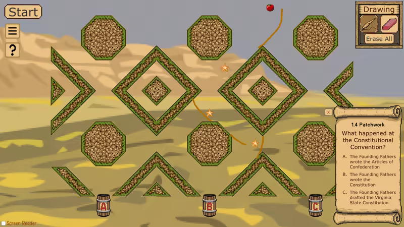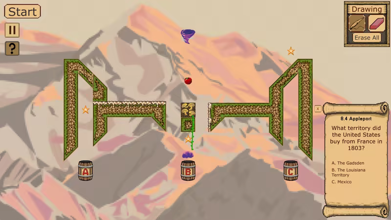 Civics Scribble is a web-based line drawing game designed to challenge players with questions inspired by the U.S. Naturalization Exam. Make your way through 96 levels across nine scenic locations based on real-life state and National Parks. You will test your knowledge of U.S. Civics while drawing lines for the inquisitive Mr. Apple to roll on or bounce off of to navigate challenges such as spikes, bouncy blocks and teleporters. Civics Scribble merges the styles of both classic retro games like The Oregon Trail and modern ones like Minecraft and Roblox.