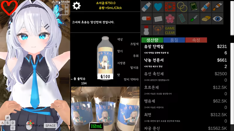 기본 조작은 마우스 클릭과 휠만. 클릭할수록 착유할 수 있습니다. 우유를 모아서 팔아 돈을 벌자.