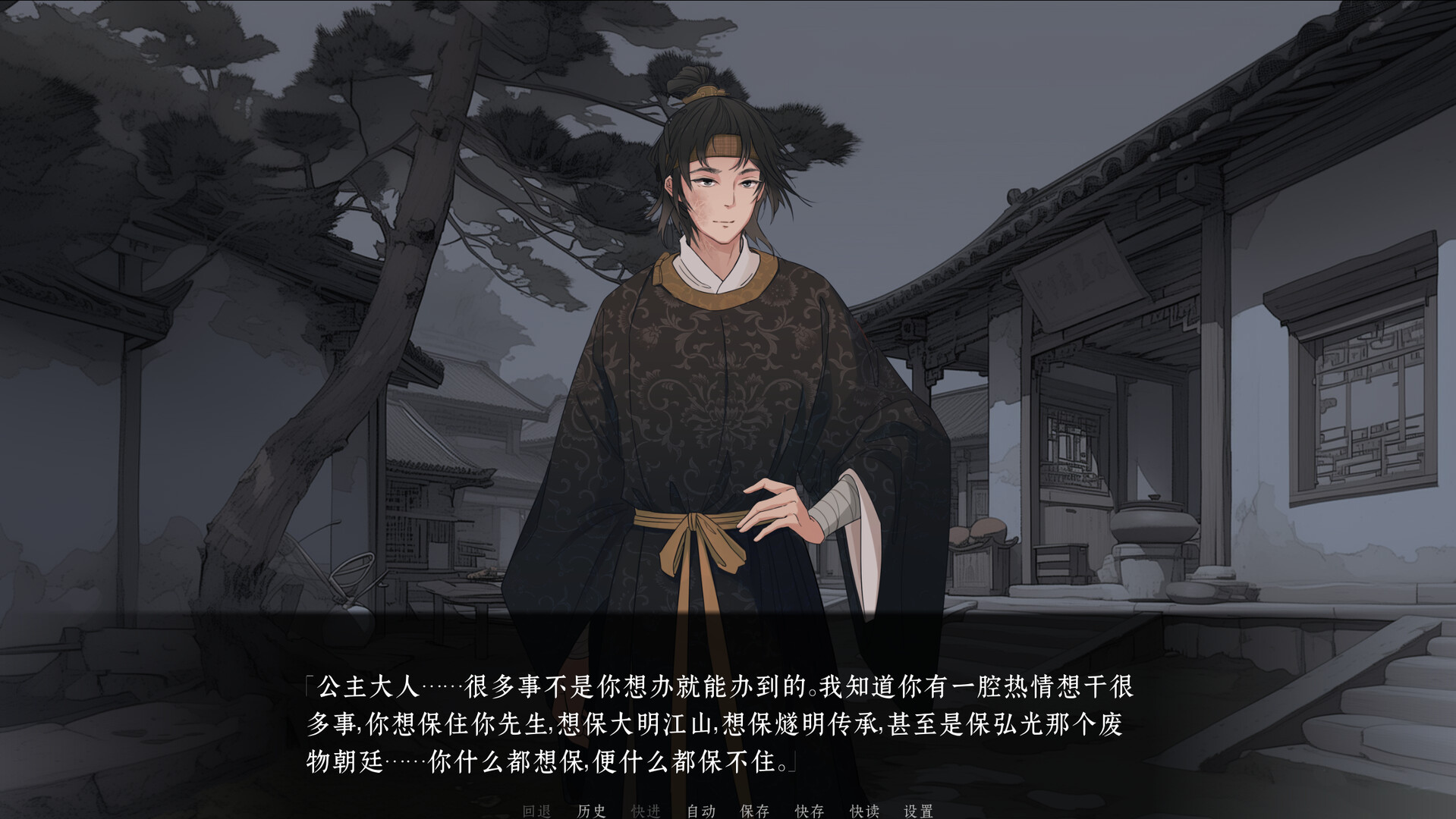 明末题材文字冒险游戏。背景为崇祯死后第二年(1645),你将扮演一名火器学者,无意中捡到了前朝公主,一场涉及复仇与真相、战乱与选择的旅途就此展开。约17万字剧情,有4个不同走向的结局和多个死亡结局。
