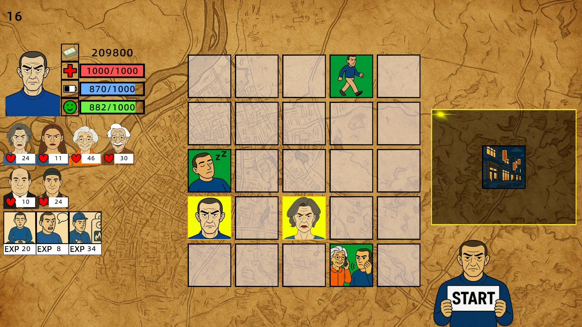 • The randomly arranged action cards and character cards on the field will determine his actions and encounters each month.